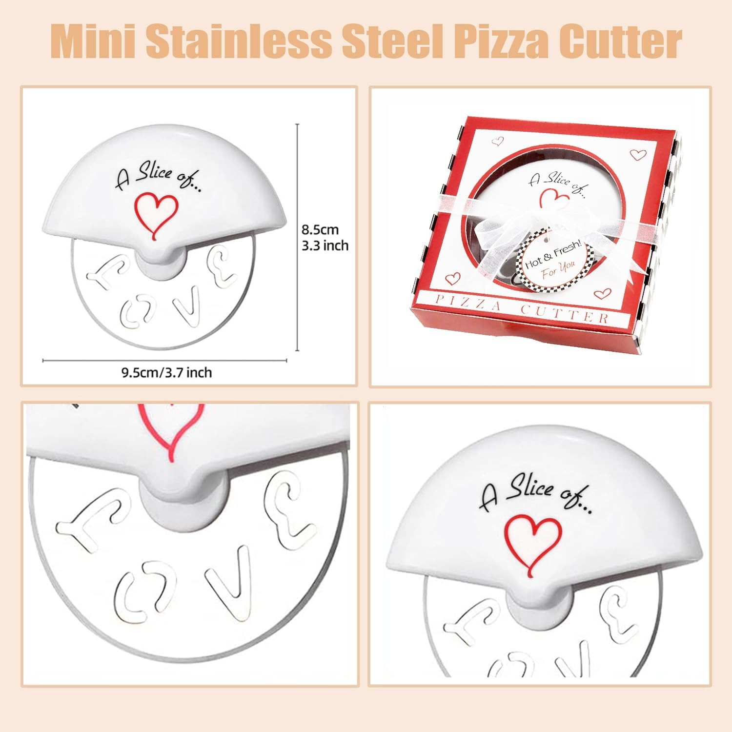 Specification: Material:Stainless Steel Size:9.5x8.5cm/3.7x3.3inch Box size:11.5x11cm/4.5x4.3inch Package:Individual Color:Silver Packaging include:30 x Mini Pizza Cutter