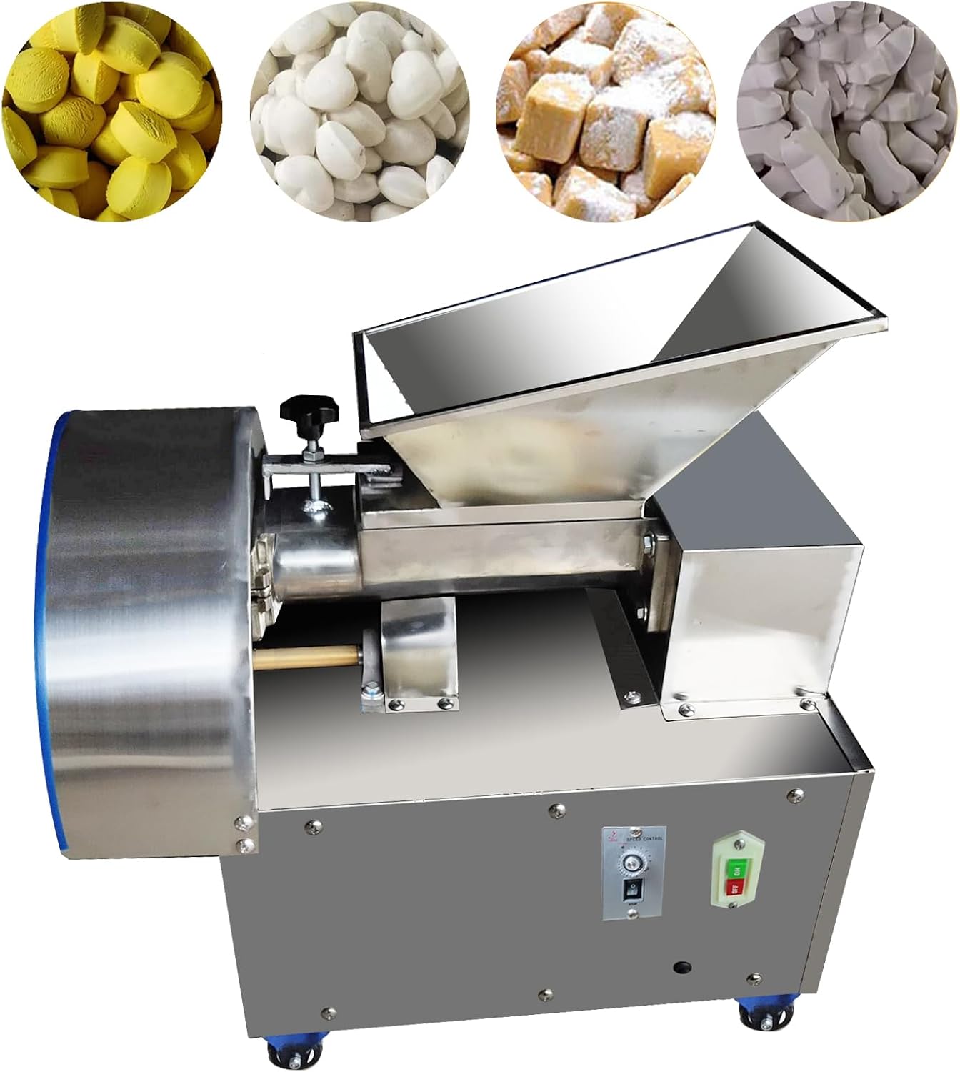 automatic dough divider cutter rounder Machine parameters: voltage:110V/60HZ or 220V/50HZ capacity: 330.6 -440.9 lb/h,150-200kg/h dough Size: 0.03-21.16OZ/1-600g( adjustable grams) Mould: 6 molds (can be customized) dough machine's weight: 99.2 lb/45KG packing weight: 154.3 lb/70kg dough cutter machine’s dimension : 23.22 *16.53 *25.19 inch/59*42*64cm Main motor: 520W Cutter motor: 0.24hp/180W package Dimension: 25.59 *19.68*25.98 inch/65*50*66cm Features of Dough ball maker Automatic Dough Extruder: product name:Dough Divider Cutter 1.Material:304 stainless steel material,Stainless steel hopper 2. dough weight can be adjustable 3. Easy to operate 4. Free offer 6 molds,It can make different shape 5.Non-stick dough cutter 6.Dough mold can be replaced:easy to change mold,meet the size of the dough various shapes 7.Advantage:can cut soft dough and hard dough 8. the size and weight of the dough can be adjusted, one button adjustment, easy to operate. 9. the processed dough is well formed, the shape is smooth, and the use effect is good. Introduction of Bread Maker The automatic dough divider is full automatic, easy to operate and clean. --After the automatic dough machine kneads the dough, the whole dough is divided into several small doughs. The machine has high efficiency, the size and weight of the dough are easy to adjust, which is convenient for customers to choose. operaiton process:Motor starts, put the dough into the feed port.And then evenly under the effect of twisted-pair dragon.The dough is squeezed to come forward,and then the rotating cutter down to cut the dough into uniform cylindrical shape dough.