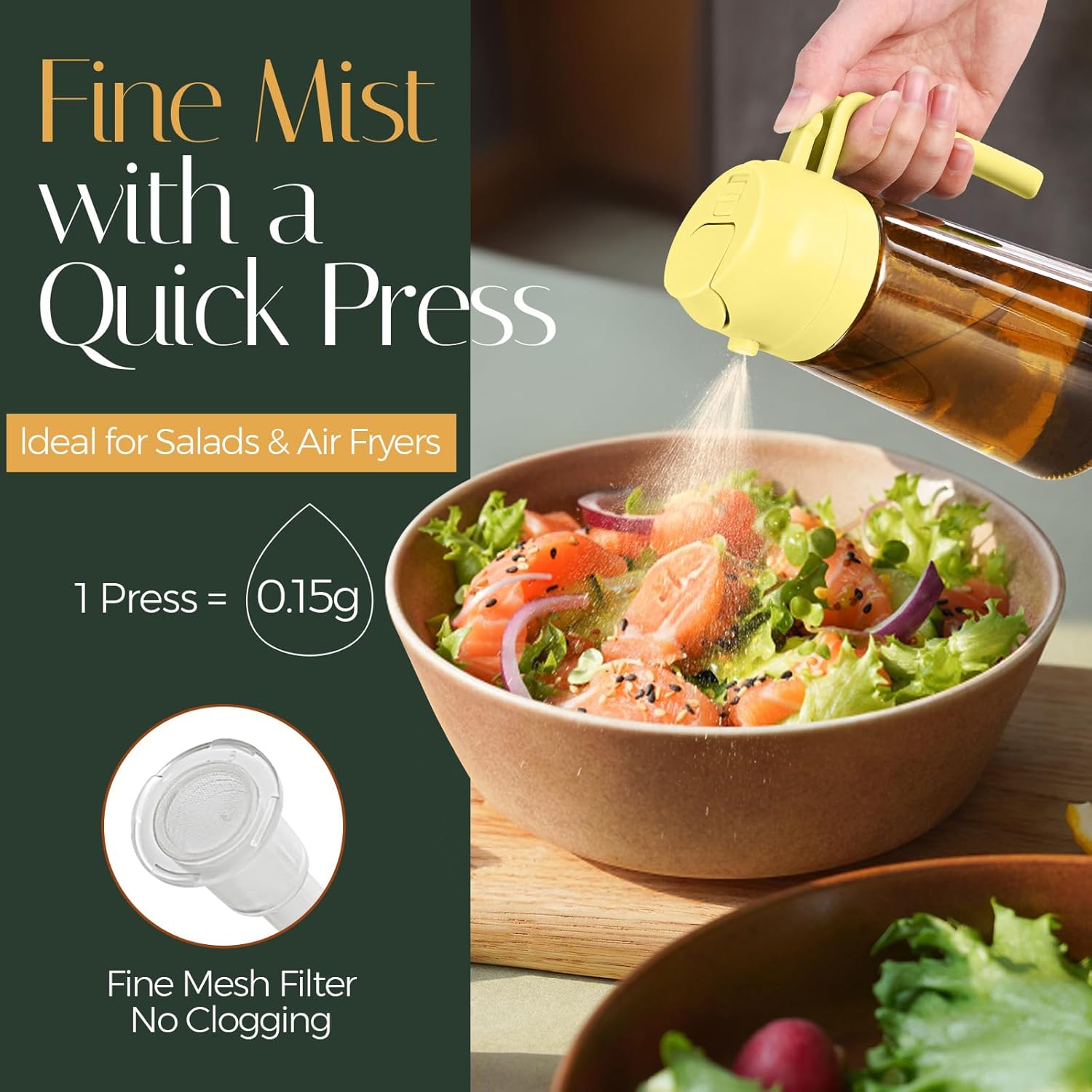 • Precise Oil Control: Cooking spray bottle can help to control the amount of oil while pouring or spraying. Each spray dispenses approximately 0.2 grams of oil, which is easily to control and measure your daily oil intake