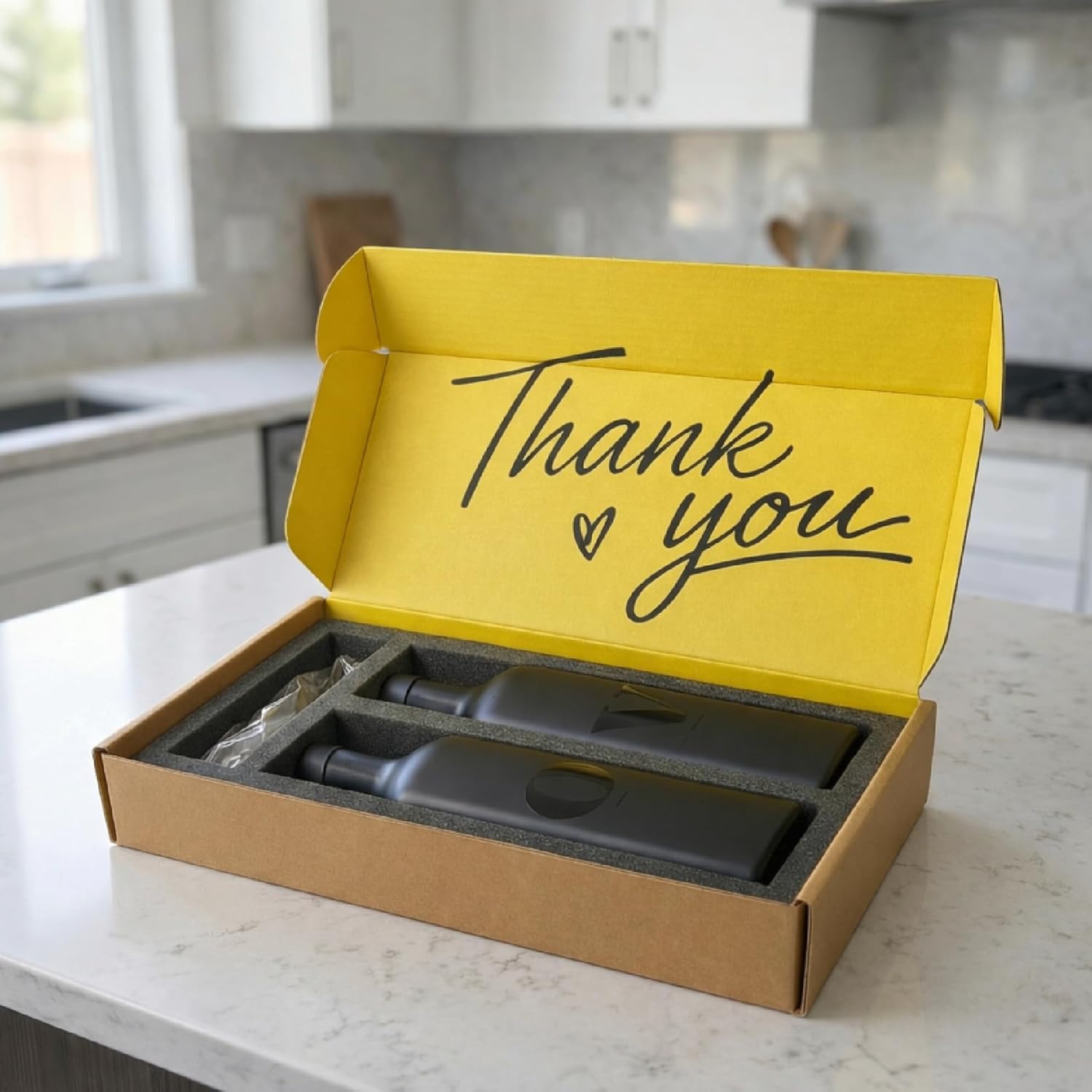 If you're investing in high-quality olive oil or aged vinegar, storing it in a mass-produced plastic bottle is doing it dirty. Our oil and vinegar dispenser set is designed for what premium oils actually need: an airtight seal to prevent oxidation, a protective body to slow down spoilage, and a controlled spout that gives you clean, precise pours every time.Whether you're marinating, dressing, cooking, or just drizzling over fresh bread, our oil dispenser set handles it all with style and efficiency. And yes—it looks beautiful enough to leave out on the table, because something this useful deserves to be seen.What’s included- 500 ml bottles: Store your most-used olive oil and vinegar without constant refills. The size of our oil & vinegar dispenser set is perfect for countertop access and easy handling while cooking.- Precision stainless steel spouts: Pour smoothly without overdoing it. The spouts of our olive oil bottle dispenser give you full control that’s perfect for a slow drizzle on salad, a quick dash in a frying pan, or finishing a dish with finesse.- Tight-fit leakproof caps: Snap them on when not in use to protect your oils from air, light, and dust.- Perfect-fit funnel: Make clean, accurate refills without wiping down greasy bottles or wasting expensive olive oil during transfers from large containers.Key features:- Easy-to-read markings: Each oil pourer bottle is clearly labeled “O” for oil and “V” for vinegar, so you can reach for the right one instantly.- Shock-resistant material: Our oil and vinegar dispenser bottle set is sturdy enough to withstand bumps, heat from nearby stovetops, and daily kitchen use.- Matte black finish with clean silhouette: The tall, modern shape adds style and helps reduce visual clutter.- Compact yet tall design: Our oil drizzler bottle set takes up minimal counter space while holding a generous amount.