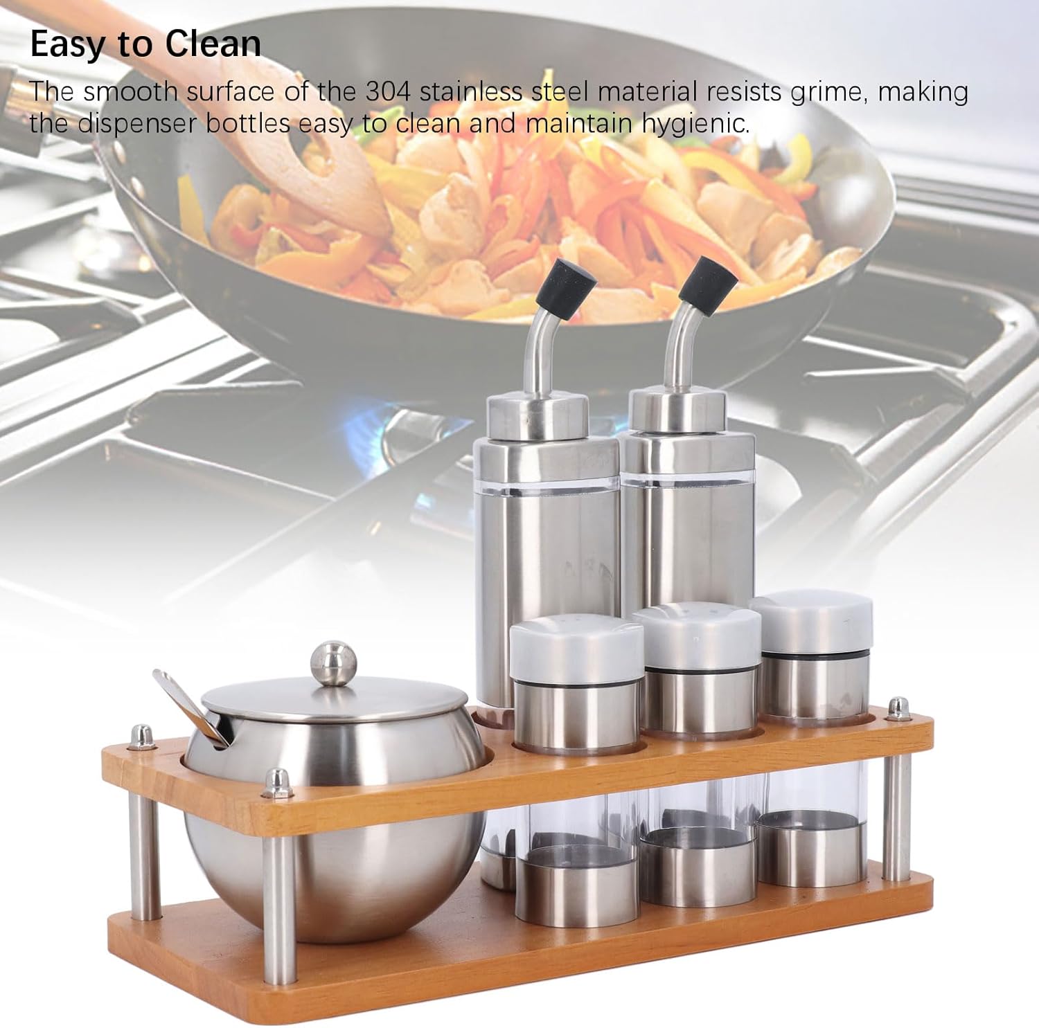1. Premium Material: Made from 304 stainless steel, they offer good erosion and high temperature performance, ensuring the security of your condiments. 2. Aesthetic Design: The combination of an wood base and stainless steel bottles creates a stylish and elegant look, enhancing the overall appearance of your kitchen or dining table. 3. Versatile Functionality: This six piece set includes various condiment jars suitable for salt, sugar, soy sauce, vinegar, , and more, catering to all your daily cooking needs. 4. Sealing Performance: The well designed condiment bottles effectively prevent air from entering, keeping your condiments flavorful while extending their shelf life. 5. Easy to : The smooth surface of the 304 stainless steel material resists grime, making the dispenser bottles easy to and maintain hygienic. Spec: Item Type: Kitchen Condiment Dispensers Set Material: Plastic, Wood, Stainless Steel Weight: Approx. 1200g / 42.3oz Package List: 5 x Dispenser Bottle 1 x Seasoning Jar 1 x Spoon 1 x Base