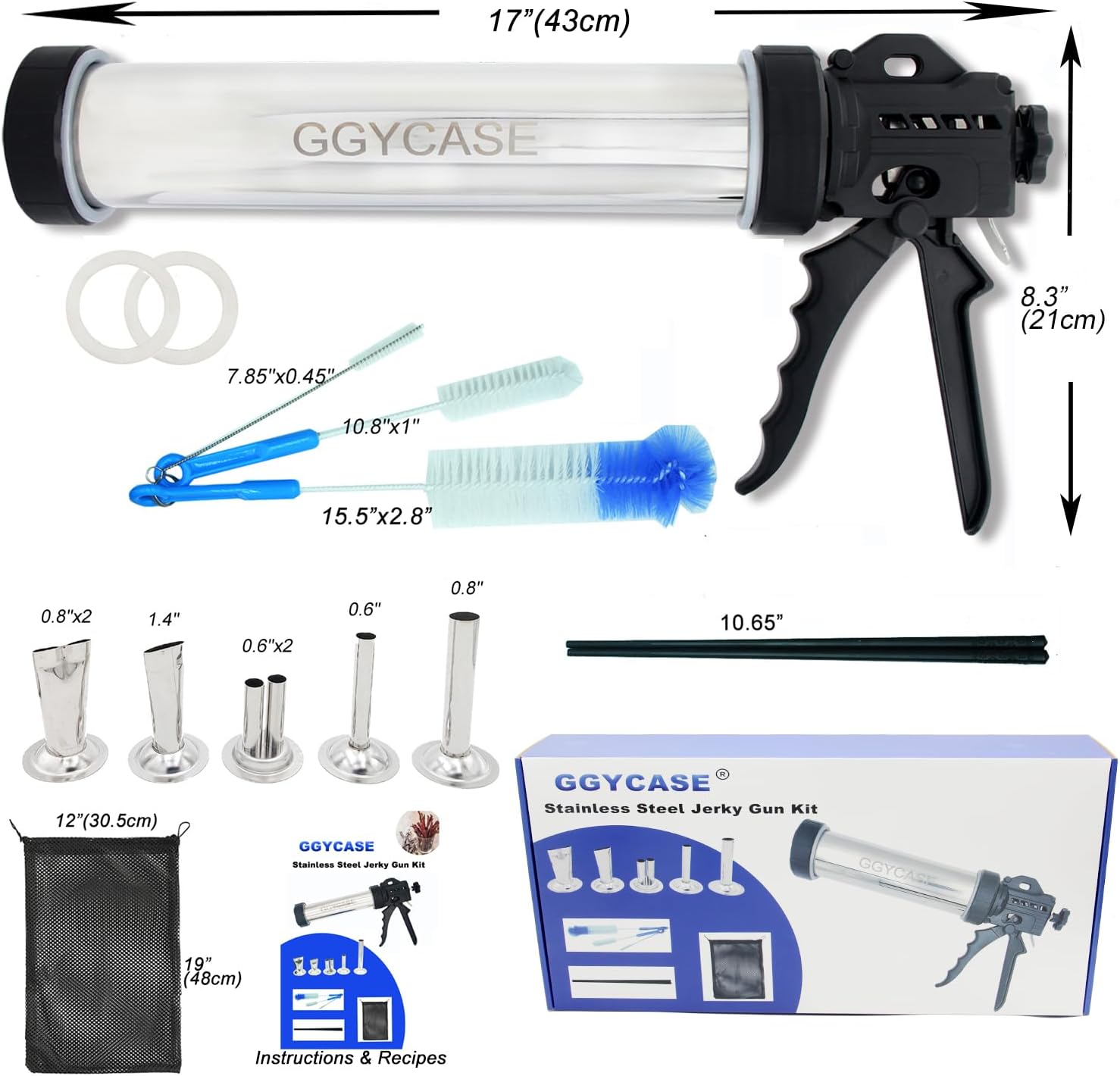 Healthy Handmade jerky kit: No need to compare the beef jerky in the supermarket. GGYCASE jerky gun helps you to make healthy and the best taste jerky from ground beef, turkey, pork, sausage. This Jerky gun kit comes with a complete set of 5 different nozzles, 3 various sizes of clean brushes. 1 mesh carrying bag, 1 pair of chopsticks. All of them will help you to make jerky at home. You can also invite friends, parents, and children to enjoy making beef jerky and barbecue at home. Popular Jerky Tools. GGYCASE Jerky Gun is a versatile and easy-to-operate jerky tool. We used a high-quality food-grade 304 stainless barrel and nozzles, healthier than aluminum and plastic. safer, more sturdy, and durable. PACKAGE INCLUDES: 1 Professional Stainless Steel Jerky Gun 5 Various Stainless Steel Nozzle Single Round Nozzle (0.6") Double Round Nozzle (0.6"x2) Single Wide Flat Nozzle(1.4") Double Flat Nozzle(0.8"x2) Sauasge Round Tube (0.8") 3 Pcs Cleaning Brushes Big brush (15.5"x2.8") Middle brush (10.8"x1") Small brush (7.85"x0.45") 1 mesh carrying bag 1 pair of chopsticks HOW TO USE: STEP 1 Press the thumb lever and pull out the pushrod. STEP 2 Load the gun with your favorite ground meat mixture. STEP 3 put the rubber gasket in the cap and set up the nozzle and tighten the cap. STEP 5 Squeeze the handle and release the perfect beef jerky. Bake them enough time. Then enjoy your favorite jerky!