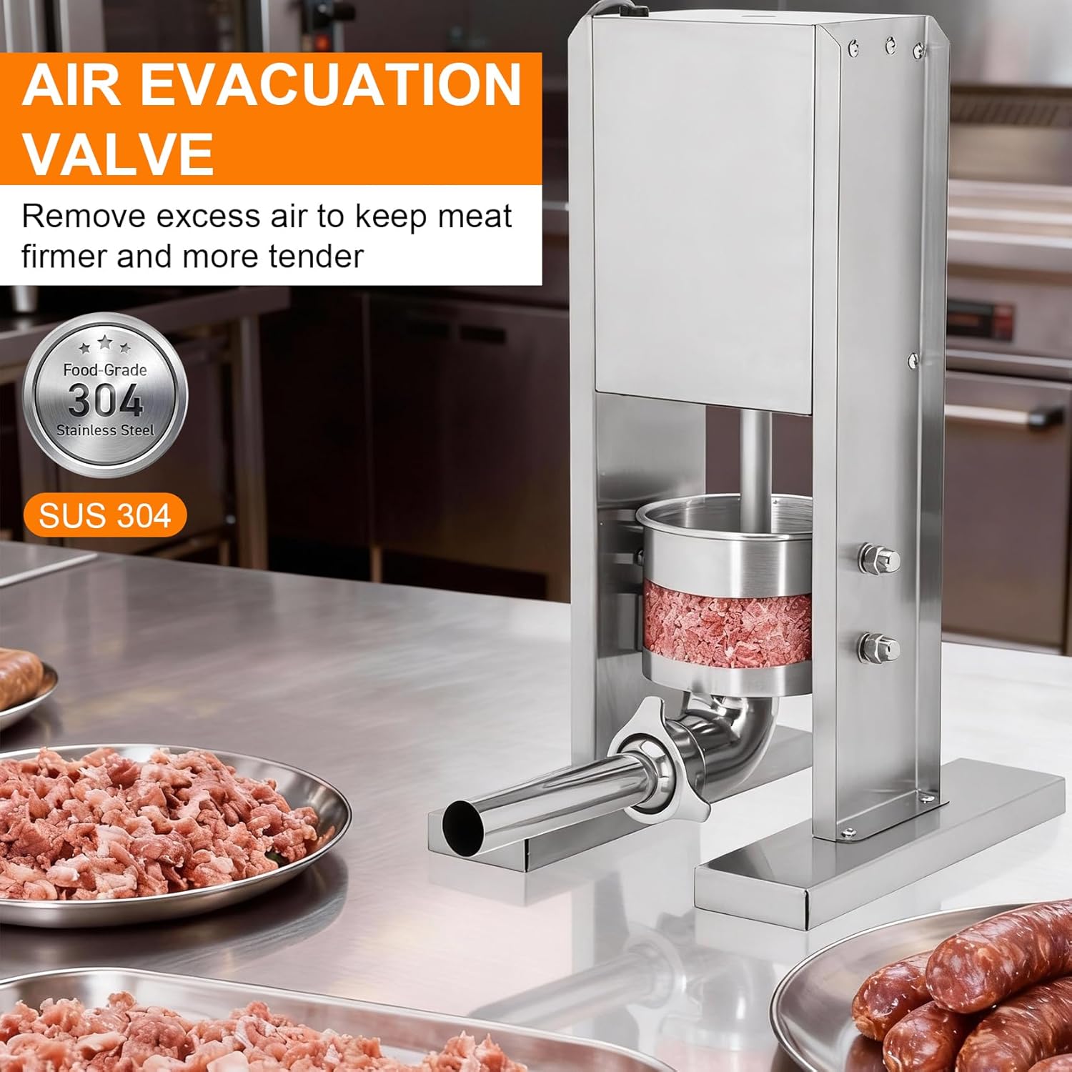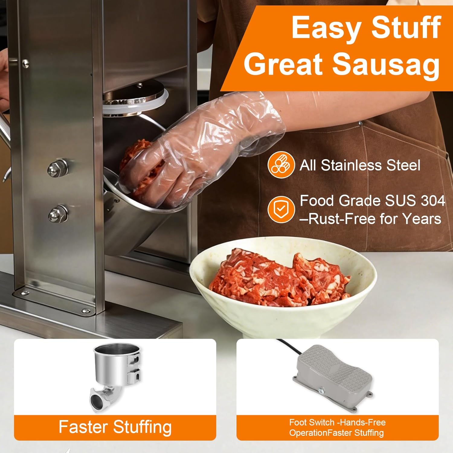 If you're passionate about homemade sausages, you already know the difference between good sausage and great sausage comes down to texture, consistency, and control. Whether you're a weekend griller or a dedicated home chef, our electric sausage stuffer is designed to give you professional-grade results without the professional-grade hassle.Say goodbye to hand-cranking and hello to effortless filling. This electric sausage stuffer machine features a responsive foot pedal that keeps your hands completely free—perfect for guiding casings smoothly and evenly. From breakfast links to bratwurst, every batch comes out consistent, dense, and beautifully formed.With a compact 2‑liter stainless steel cylinder, this meat stuffer is built for home use but performs like a workhorse. The entire unit—from the cylinder and base to the tubes—is crafted from food-grade stainless steel, ensuring rust resistance, easy cleaning, and safe food contact every time you use it. Whether you're making Italian sausage, chorizo, or custom blends, you can trust that every part that touches your meat meets the highest hygiene standards.Versatility is at the heart of this sausage stuffer electric machine. It comes complete with three different-sized food-grade stainless steel filling tubes, so you can easily switch between casings of various diameters. Whether you're a beginner exploring new recipes or an experienced cook looking for precision, this sausage machine gives you the control you need.We've also integrated a smart air release valve into the piston design. It helps eliminate trapped air pockets—one of the most common frustrations when using traditional sausage stuffers—ensuring a dense, professional texture and preventing casings from bursting during cooking.If you've been searching for a reliable sausage maker machine, look no further. This unit combines durability, ease of use, and thoughtful design into one compact package. And for most households, it's the perfect electric sausage stuffer for making authentic, homemade sausages with ease.Backed by a 1‑year warranty and lifetime customer support, this is more than just a tool—it's your new partner in the kitchen. Whether you're a passionate sausage maker or just getting started, this machine will help you craft sausages you’ll be proud to share.