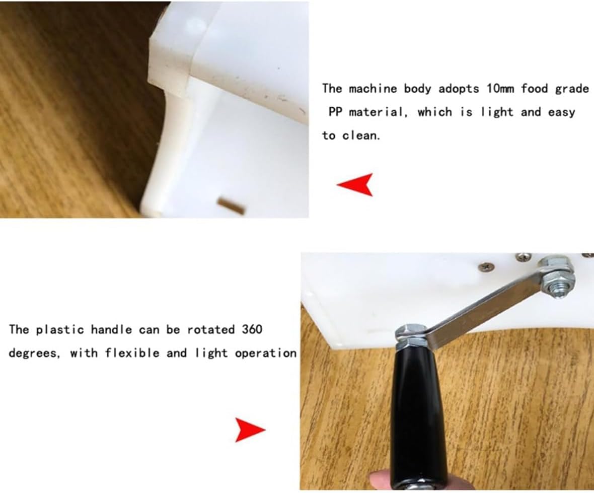 - The body is made of 10mm food-grade PP material, which is lightweight and easy to clean.- The plastic handle can be rotated 360 degrees, making the operation flexible and light.- The operation panel can be configured according to personal needs. Once you have determined the size, tighten and secure so you can tie the sausage scale. more accurate.- High-quality pure copper gears are matched with plastic gears for smoother rolling, longer life, and lighter body.- The thread binding operation is simple and the effect is firm.- Fixing bolts can be fixed on the workbench. Stable and easy to operate.Product name: Manual sausage tying machine.parameterModel: YCS-400.Dimensions: 460 x 250 x 210 mm.Material: food grade PP and 304 stainless steel.Operation: manual operation.Net weight: 3.5kg.