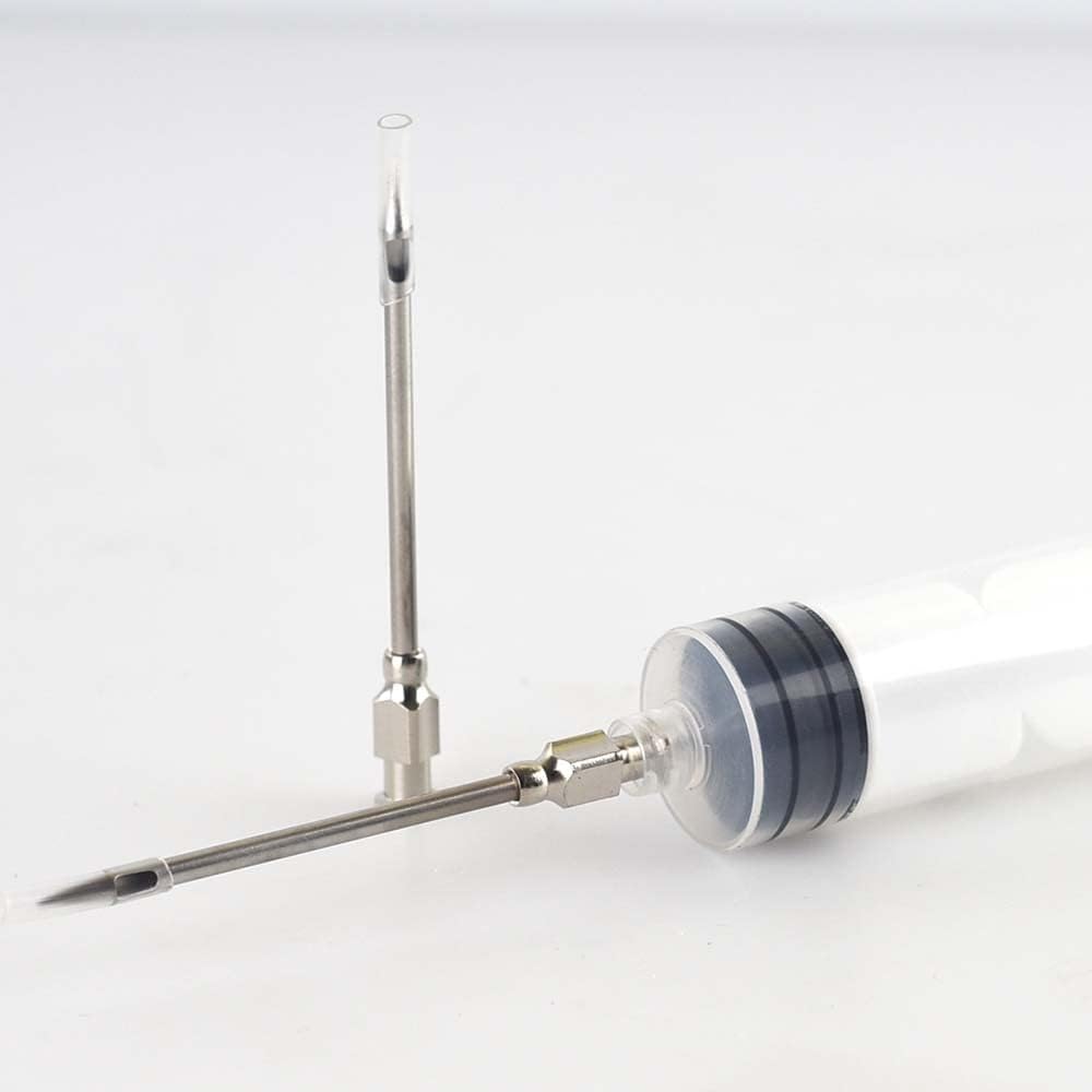 This 3inch needle is used for injecting a marinade that might have small spice or herb particles. It features brass hub with nickel plated,and 2holes on opposite sides of the 307 stainless steel tubing perfect for great marinade distribution .