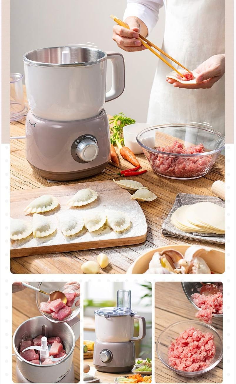 Chopping cup inner wall: 304 stainless steelMaterial of shredded slicing plate: stainless steelRated power: 300WNet weight: 2.2kgMaterial of shredding blade: stainless steelContinuous time: meat, vegetables ≤ 30 seconds; shredded and sliced ≤ 60 secondsProduct size: 235mm X 204mm X 362mm