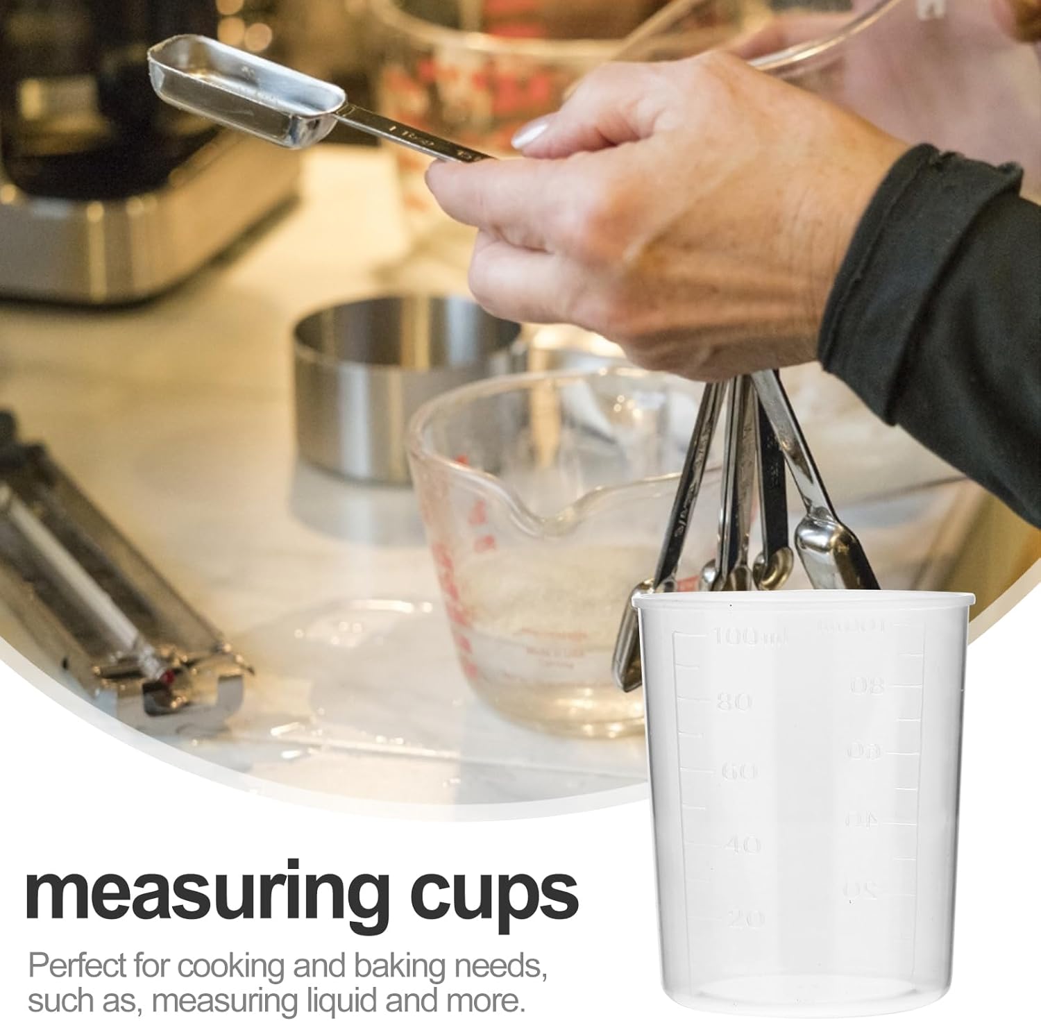 • Plastic beaker cups: perfect for measuring liquid or dry ingredients such as baking powder, baking soda, milk and anything in small quantity.Plastic graduated measuring cup: ???you can use it to measure rice, water, etc. it is a practical tool at kitchen.Measure cup: it is a practical measuring device for laboratory when doing experiments.Measuring: smoot