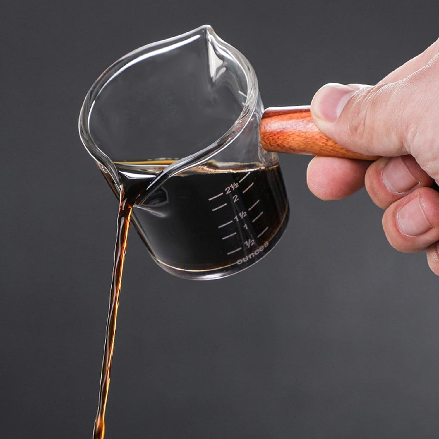DAOUXIAOSPFeatures:- The design are flexible for easy, precise pouring, save and economy cost.- Our coffee measuring shot glass is made of thick borosilicate glass, much harder and stronger, they are more heat- - Borosilicate is environmentally friendly, - free and widely used in high- end cookware and drinkware.- Our espresso shot glass measuring cup is designed with 2 spout for easy pouring without turning.- Graduated marks read in milliliters for all your measuring needs.Specification:- Color: Transparent.- Material: Glass.- Size: 4. 1x3. 1x2. 2 inches/ 10. 5x8x5. 5cmPackage Including:1 x Espresso Shot Glass with Wood Handle
