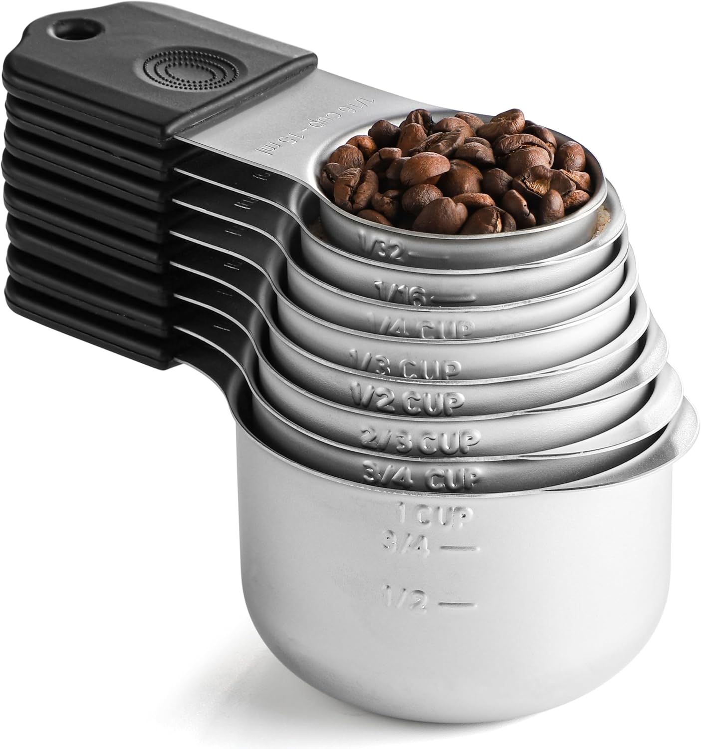 Magnetic measuring cups Set have 8 different sizes: 1/16 cup 15ml 1/8 cup 30ml 1/4 cup 60ml 1/3 cup 80ml 1/2 cup 120ml 2/3 cup 160ml 3/4 cup 180ml 1 cup 240ml Material: Made of high-quality stainless steel, strong material; Magnetic Measuring Cups: The handle contains magnetism, and the humanized design of the oval silicone handle makes it comfortable to hold; Black Handle: Silicone handle, comfortable grip without cutting hands. Easy To Store: The magnetic stainless steel measuring cup set can be stacked and placed flat; it is also equipped with a stainless steel ring, which can be hung, and is easy to store after use, saving your kitchen space.