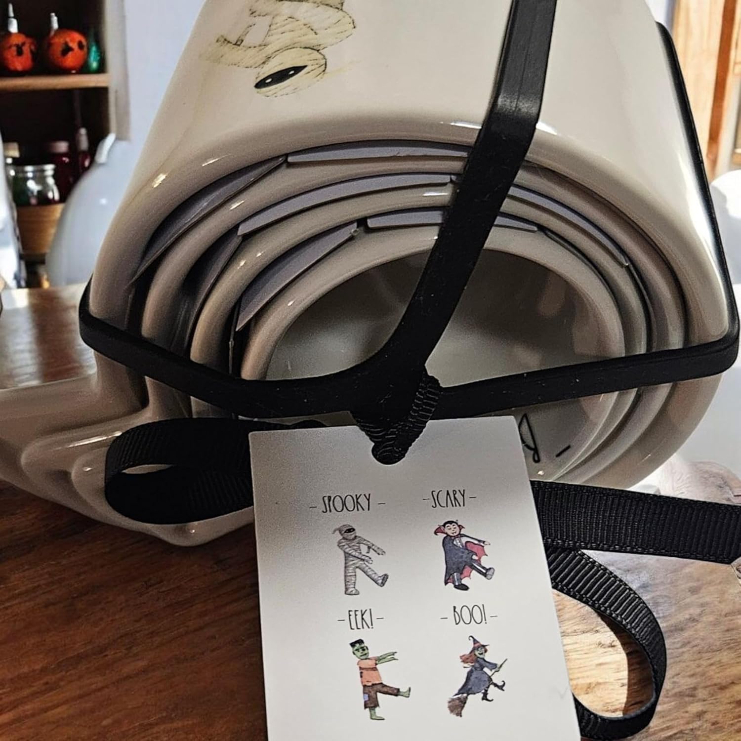 Bring festive fun to your kitchen this Halloween with this set of 4 ceramic measuring cups featuring adorable hand-painted spooky characters like a mummy, witch, vampire, and monster. Each cup nests neatly for easy storage and is tied with a sleek black ribbon for a charming, gift-ready look. Perfect for seasonal baking, decorating, or adding a touch of Halloween cheer to your countertop. 🎃 Product Details: Set includes: ¼ cup, ⅓ cup, ½ cup, and 1 cup Durable ceramic construction Stackable, easy to store, and display-worthy Neutral tones with cute Halloween artwork Ideal gift for bakers or fall décor lovers 👻 A festive kitchen accessory that’s both functional and fun!