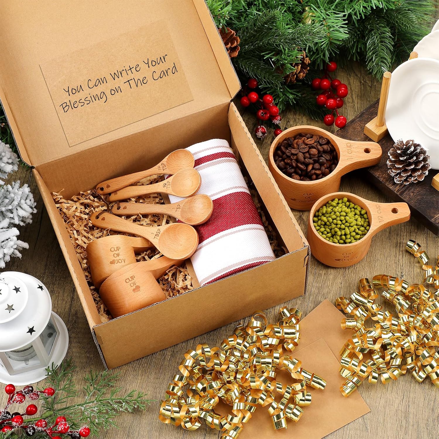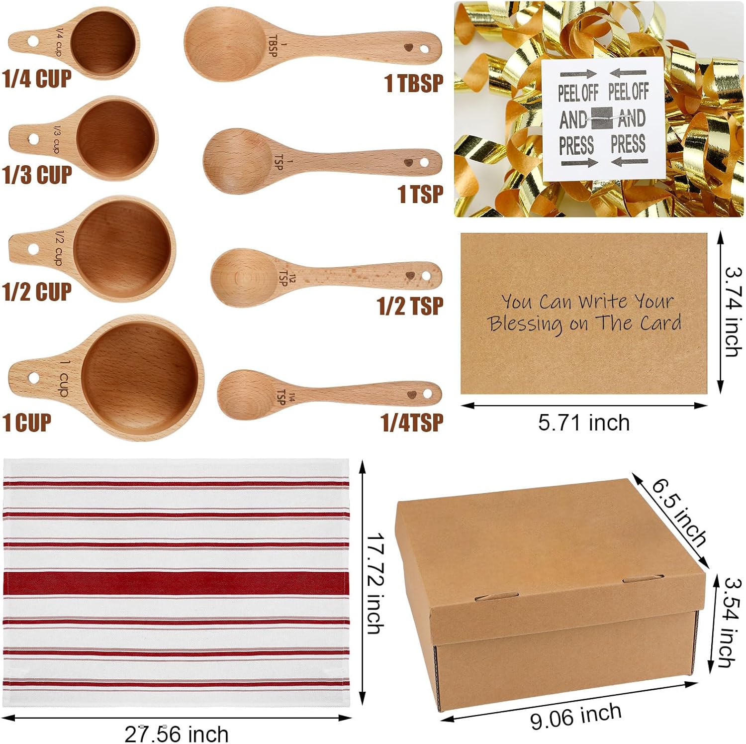 Features: Space saving design: Craftsmanship truly shines in this set. Decorative measuring cups offer stackable design accompanied by a hanging rope. This smart design not only adds an aesthetic splash to your kitchen but also saves valuable kitchen space. Ideal gifts: Gift this measuring cups and spoons set to loved ones who adore cooking or baking, or as a beautiful housewarming or Christmas present. It's a special addition to holiday baking and cooking endeavors, sure to make the experience all the merrier. Specifications: Material: Measuring cups and spoons: beech wood Tea towel: cotton Color: multicolor Size: Towel: 17.72 x 27.56 inches Gift box: 9.06 x 6.5 x 3.54 inches Kraft paper card: 5.71 x 3.74 inches Package includes: 4 x Measuring cups 4 x Measuring spoons 1 x Tea towel 1 x Self adhesive curling bow 1 x Gift box 2 x Kraft paper cards 1 x Shredded kraft paper Notes: Manual measurement, please allow slight errors on size. The color may exist a slight difference due to different screen displays.