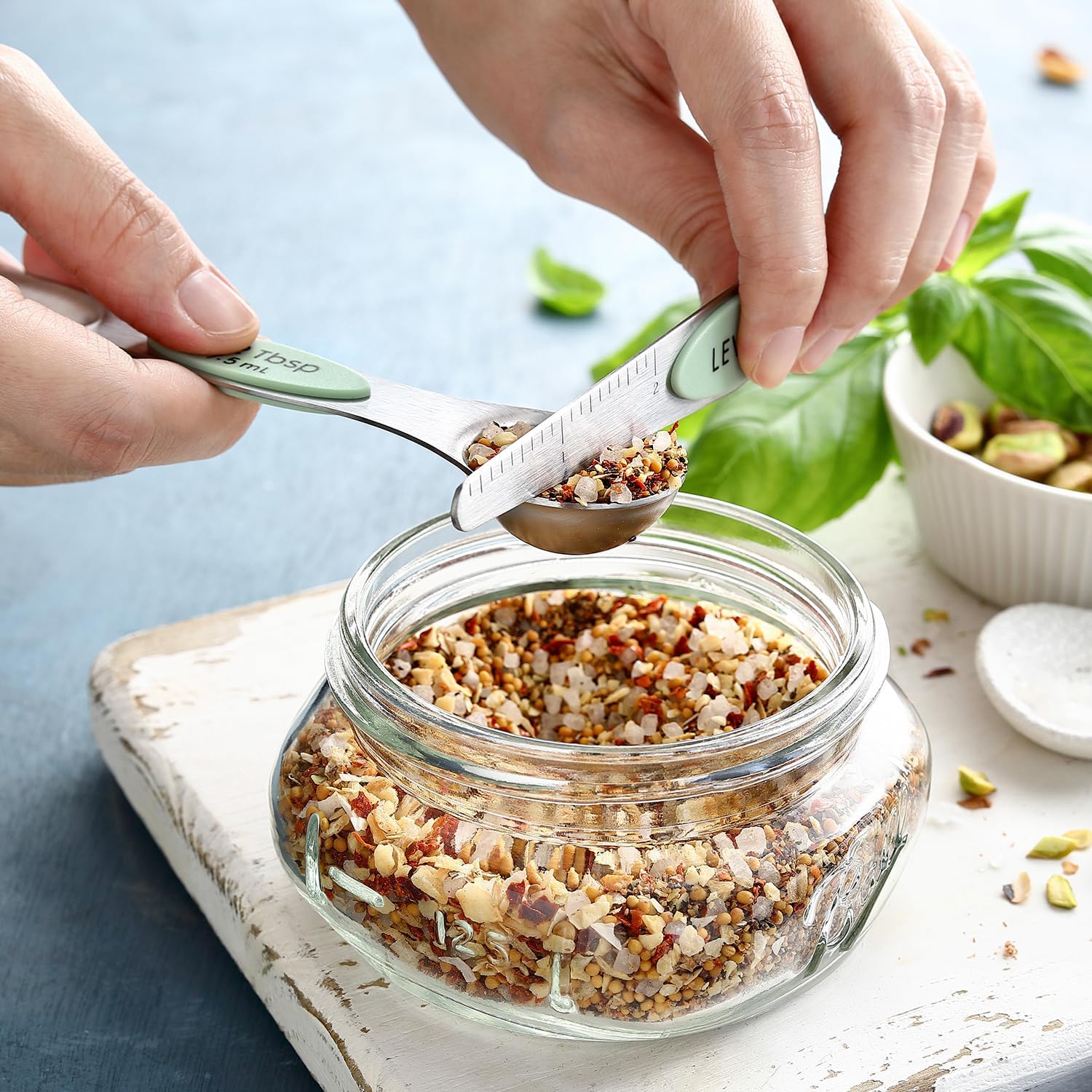 Spring Chef Dual Sided Magnetic Measuring Spoons Set, Pistachio, Set of 8 & Stainless Steel Measuring Cups, Set of 7 - 2 Product Bundle