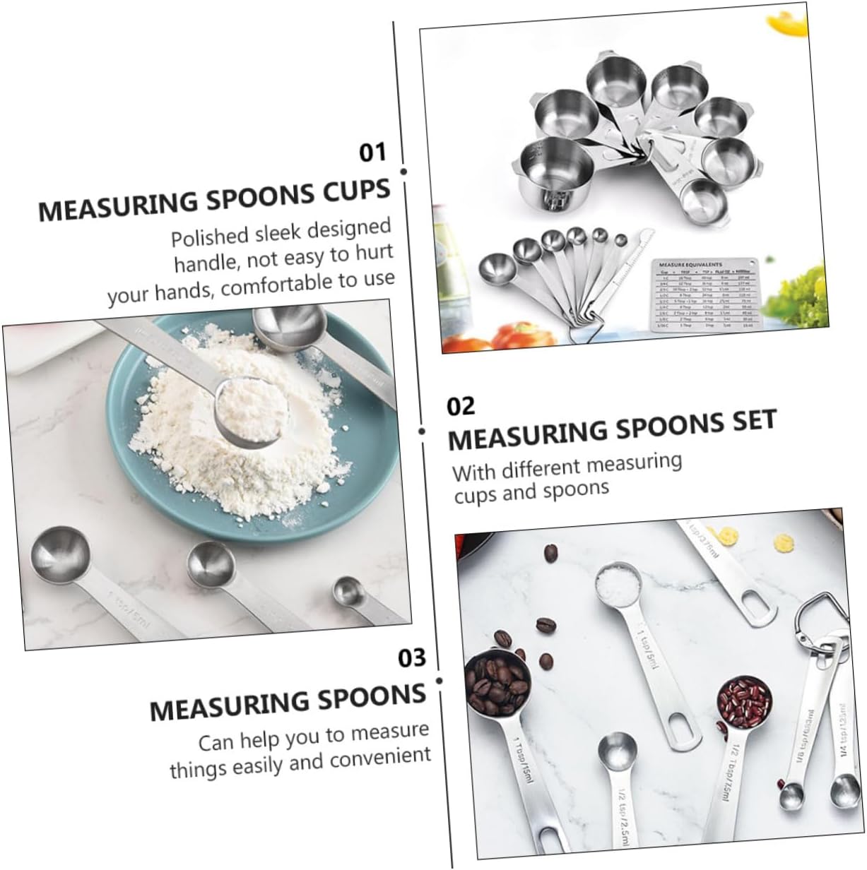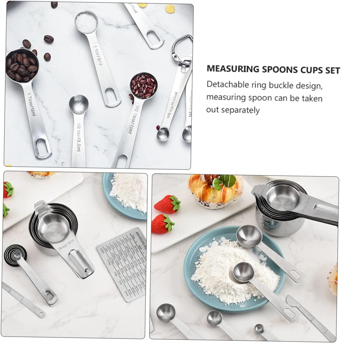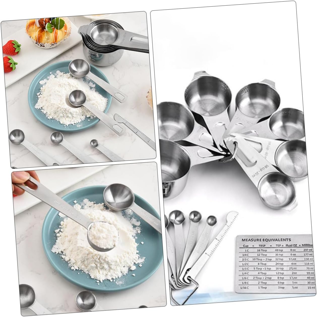 Package List 7 x measuring spoons 7 x measuring cups 1 x graduated scale Characteristics - Size: About 11.00X8.30X0.20cm/4.32X3.26X0.08inch stainless steel measuring spoon. - Color: Silver stainless steel measuring spoons set. - Material: Stainless Steel measuring spoons. - This set is consisted of 7 pcs measuring cups, 7 pcs measuring spoons and a graduated scale measuring spoons cups set. - Effective and efficient transfer of materials with its large capacity household spoon. - For serving tea, grain, flour, and rice, etc portable kitchen tools. - It is easy to use and operate, bring much convenience to you multi-purpose measuring tools. - Made of , very sturdy and measuring spoon.Goods Descriptionstainless steel measuring spoon This set is consisted of 7 pcs measuring cups, 7 pcs measuring spoons and a graduated scale, which is made of , very sturdy and .multi-purpose measuring tools A good helper for your kitchen.household measuring spoon For serving tea, grain, flour, and rice, etc.portable kitchen tools Effective and efficient transfer of materials with its large capacity