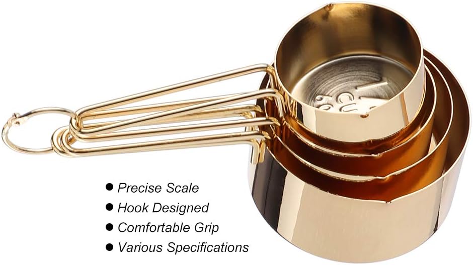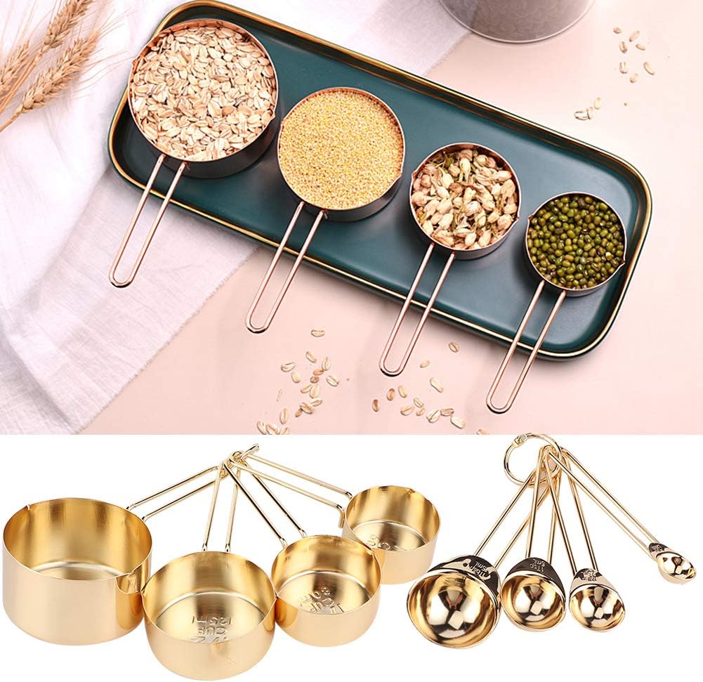 BINGWANGSpecification:Condition: Brand NewItem Type: Measuring Spoon CupMaterial: 304 Stainless SteelColor: Rose Gold, Gold Weight: Approx. 338g / 11.9ozApplication: Home, Milk Tea Shop, Bar, Coffee Shop, etc.Product Size:1/4CUP 60ml: Approx. 56x78mm / 2.2x3in1/3CUP 80ml: Approx. 62x78mm / 2.4x3in1/2CUP 125ml: Approx. 72x78mm / 2.8x3in1CUP 250ml: Approx. 82x78mm / 3.2x3in1/4 Teaspoon 1.25ml: Approx. 19x78mm / 0.7x3in1/2 Teaspoon 2.5ml: Approx. 26x78mm / 1x3in1 Teaspoon 5ml: Approx. 32x78mm / 1.2x3in1 Tablespoon 15ml: Approx. 42x78mm / 1.6x3inPackage List:8 x Measuring Spoon2 x BuckleNote:1.Pleaseallow0?1incherrorduetomanualmeasurement.Thanksforyourunderstanding.2.Monitorsarenotcalibratedsame,itemcolordisplayedinphotosmaybeshowingslightlydifferentfromtherealobject.Pleasetaketherealoneasstandard.