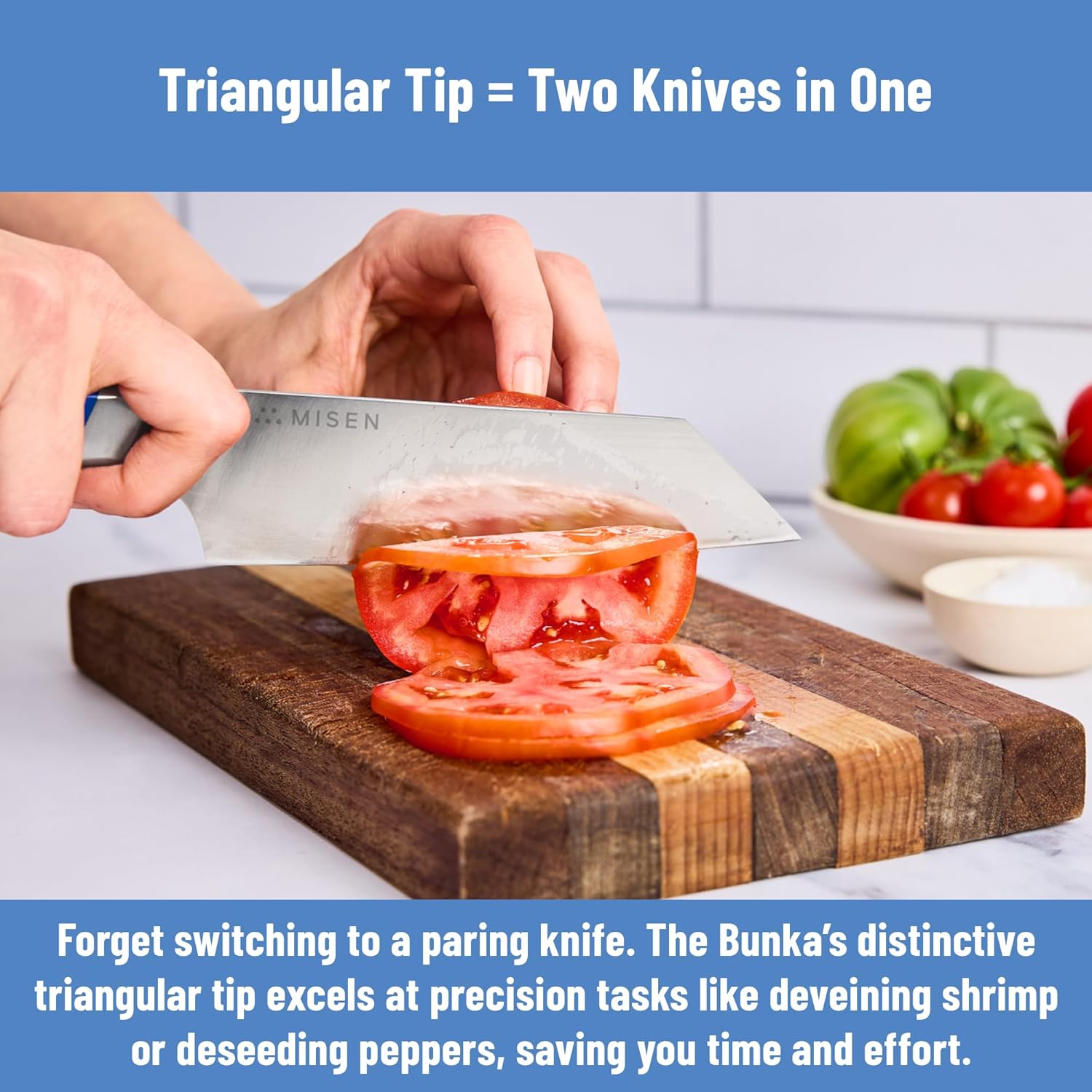• Triangular Tip for Precision Work – Use the blade tip like a paring knife to trim, devein shrimp, de-seed peppers, or mince shallots — no extra tool needed.