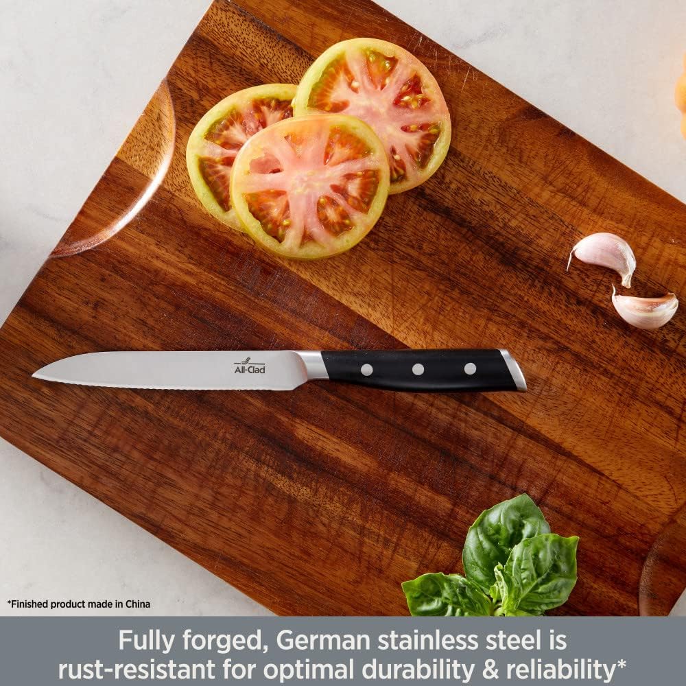 All-Clad Forged Knives bring a perfect balance of craftsmanship and performance. The fully forged design features German stainless-steel blades* optimized by a cryogenic treatment for better performance, durability, and corrosion resistance. The 18-degree total cutting edge ensures expert cutting precision without chipping - not only promising to start sharp but to stay sharp. The fade-resistant, triple-riveted POM handle features a full tang and angled end bolster, comfortably accommodating all types of grips. *Finished product Made in China