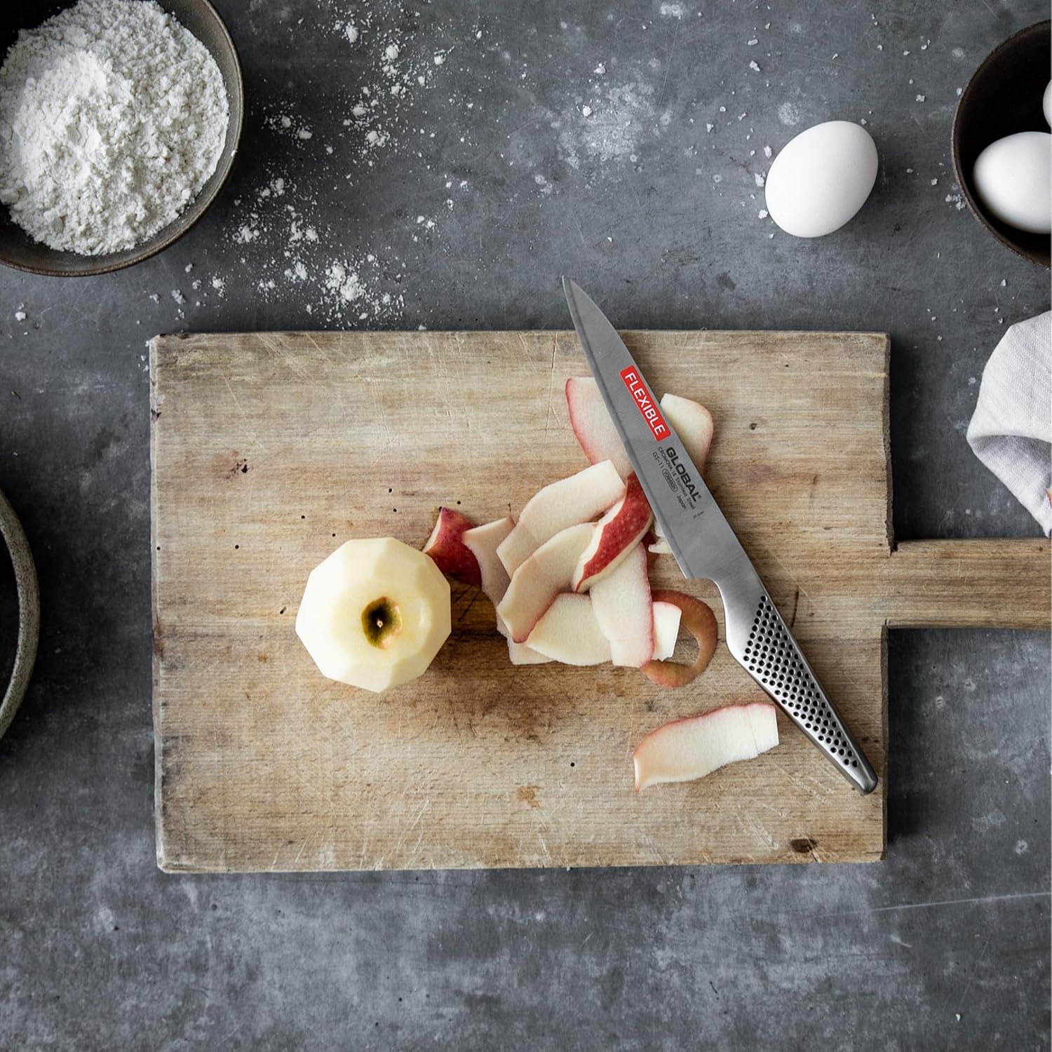 The slightly longer curved ergonomic handle provides a comfortable grip and features 7 signature black dots which represent the 7 Samurai codes of honor and moral principles. The beautiful hammered finish applied to the patented Cordova 18 core (Chromium, Molybdenum, Vanadium and Carbon) produces air pockets which help release food while cutting, giving the blade non-stick properties. Legendary industrial designer Komin Yamada brings a new age of innovation to Global cutlery with Sai, unifying function and design, these distinctive Japanese knives combine revolutionary ergonomic handles with triple-layered steel blades that maintain their exceptionally sharp edges. The first new cutlery line produced by Global in more than 25 years, Sai blends the Japanese company's tradition of craftsmanship with modern technological advancements. The knives combine three layers of steel: a core of patented, ultra-hard Cromova 18 Sanso stainless-steel alloy and two outer layers of more flexible 18/8 steel for added strength and resistance to rust. Professional-quality blades are ice-hardened and tempered to increase hardness, resist corrosion and maintain long-lasting sharpness. Each blade is hand-hammered to create hollow air pockets that reduce drag, allowing the blade to glide through food without sticking. 12.5-degree blade edge is mirror-polished by hand for exceptionally long-lasting sharpness. The perfectly balanced handle has an ergonomic thumb rest for a smooth, efficient cutting motion and steady, comfortable grip. Made in Japan.