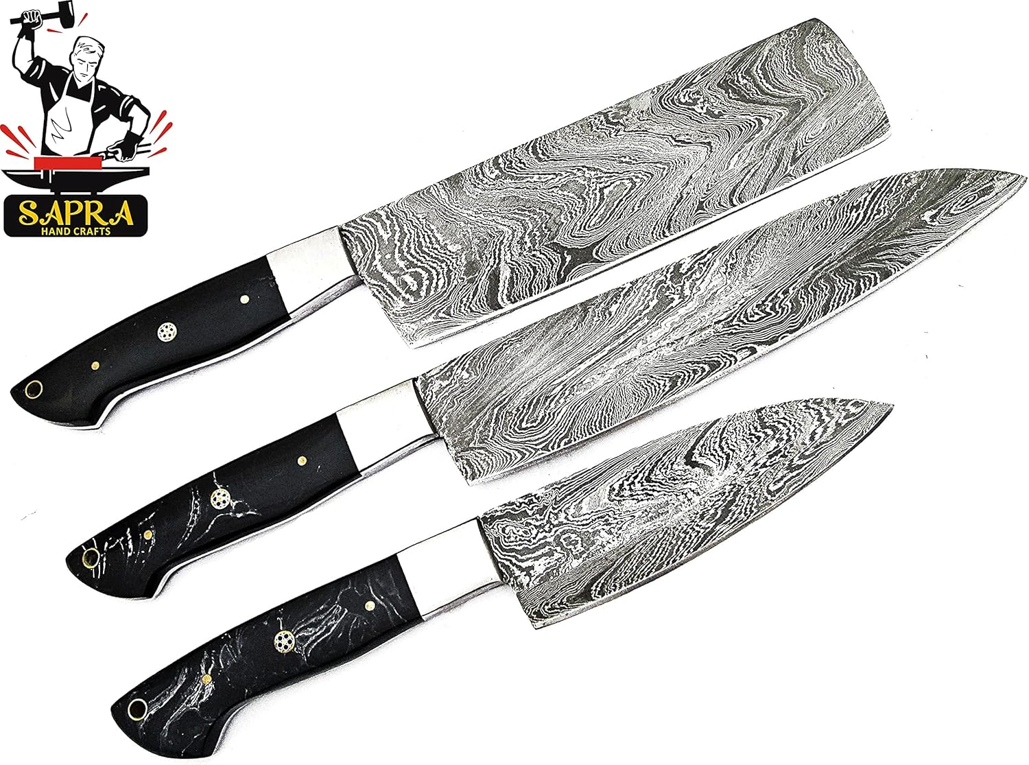 Hand forged Damascus steel kitchen chef knives set with leather bag The high grade Damascus steel use for these consist of layers low carbon and high carbon mixture pattern welded and hammered several times to obtain up to 236 layers. The hardness of blades is up to 58 HRC on the Rockwell scale.This will stand the test of time, holding its sharp Blade Thickness: 2 mm - 2.5 mm.100% workable.This set of knives is best choice of Gift.Buy with confidence Damascus steel kitchen knives set.