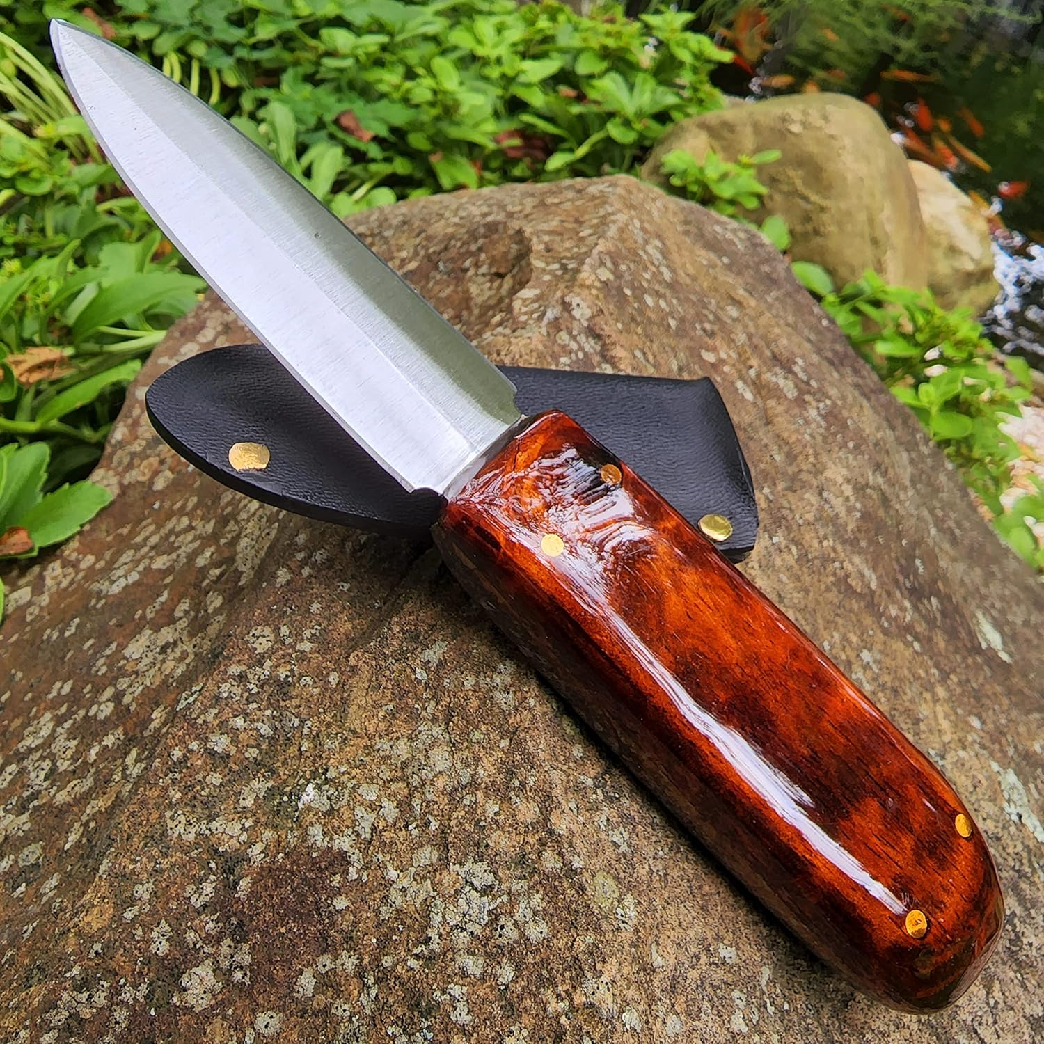 Handmade Paring Knife - Custom Made In USA Kitchen Knife / Dual Edge Kitchen Knife with Sheath This custom handmade knife is painstakingly hand-forged in my personal shop. 30 hours of craftsmanship went into this blade. Perfect for Every Day Cooking/Food Prep work. This double edged paring knife will no doubt become your favorite go-to blade for every task. So sharp you can shave with it. Blade has been painstakingly shaped and profiled to create two perfectly sharp cutting edges to make fast work of any kitchen duty. Knife has been hardened and tempered to allow for a super durable edge. The hardwood in the handle is reclaimed, and hand sanded with 2500 grit sandpaper, stained with burnt umber wood stain, and sealed with high gloss, high hardness resin, making a permanently waterproof finish. The 4 handle pins are peened and made of 1/8" solid brass rod. These too have been polished to a mirror finish. Made from Handforged 1095 Hi-Carbon Steel Razor sharp edges are sharp enough to shave with, and tough enough to withstand heavy use. Hardwood handle made of super tough, tight grained, dense reclaimed Walnut wood. Full Tang Knife with 1/8" tang pins, peened. Blade was normalized then tempered at 400°F for 2 - 2 hour sessions. Handle is sealed with high gloss clear resin, to ensure a watertight, long life finish. Blade Measures: 3 1/2 inches long 3/4 inches wide .10 inches thick Handle Measures: 3 1/2 inches long 1 inch wide 0.75 inches thick Full Knife Measures: 7 inches long