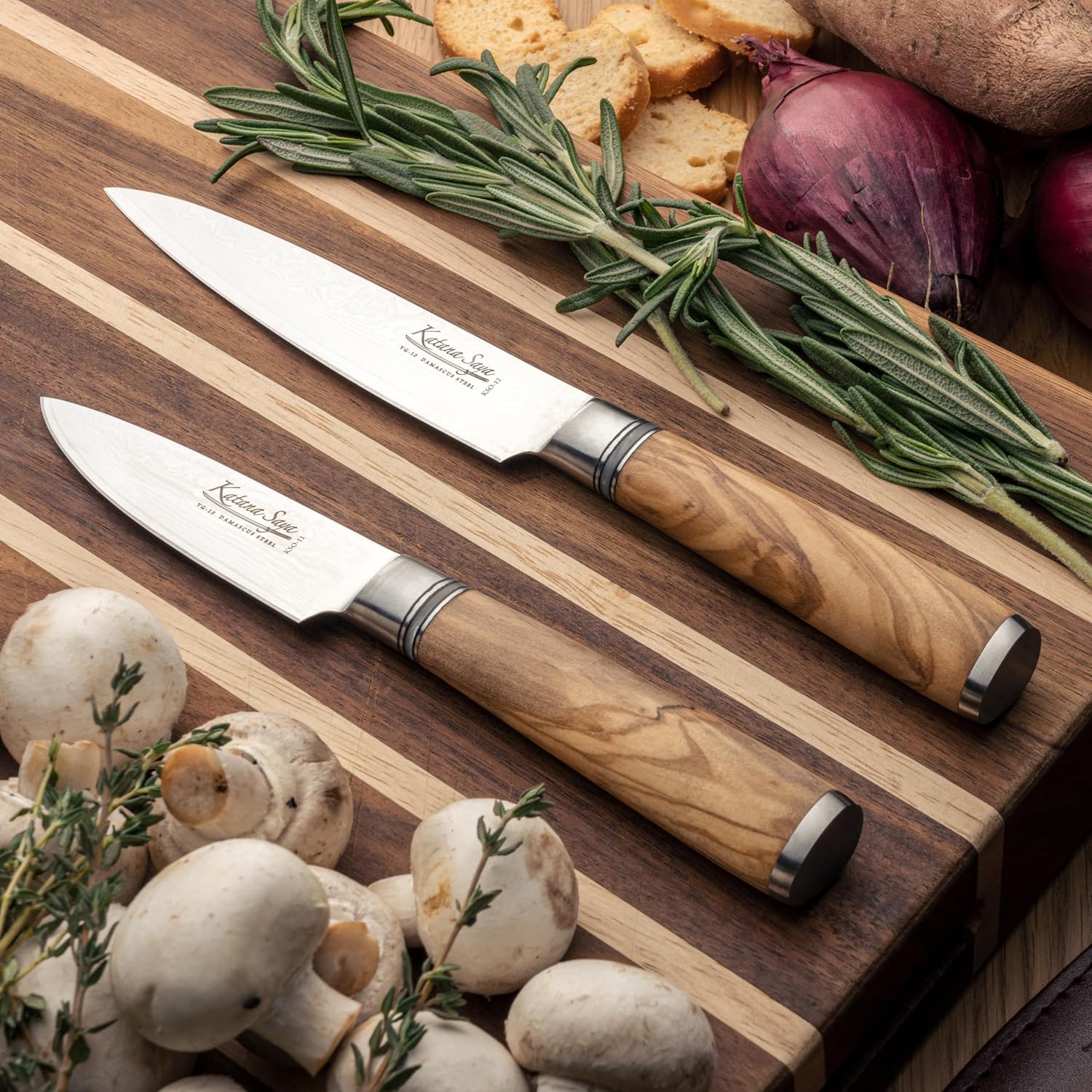 Katana Saya is a new, innovative knife brand, inspired by the chefs and centuries long cooking traditions of both the Eastern and Western worlds. We strive to bring the very best of these two cuisines together in our knife ranges, in a celebration of the different food cultures and traditions of our times. Created in the style of Japanese Samurai swords from high quality 67-layer Damascus steel, the blades are incredibly robust and sharp, and feature chestnut shaped handles made from natural wood to provide stability and perfect balance while preparing food. The 9cm Paring knife is the smallest in the range, as well as being one of the most useful. This small, nimble blade is well suited for peeling vegetables as well as de-seeding and coring preparing fruit. It can also be used for any small, delicate tasks in the kitchen. About the brand: Founded in 1945, the award-winning Grunwerg family business produces high-quality household goods and catering products, specializing in high-quality steel. The company is headed by the Grunwerg family, which is located in the steel town of Sheffield. The guaranteed high-quality Grunwerg product range remains the first choice among professionals and renowned chefs in the food industry.
