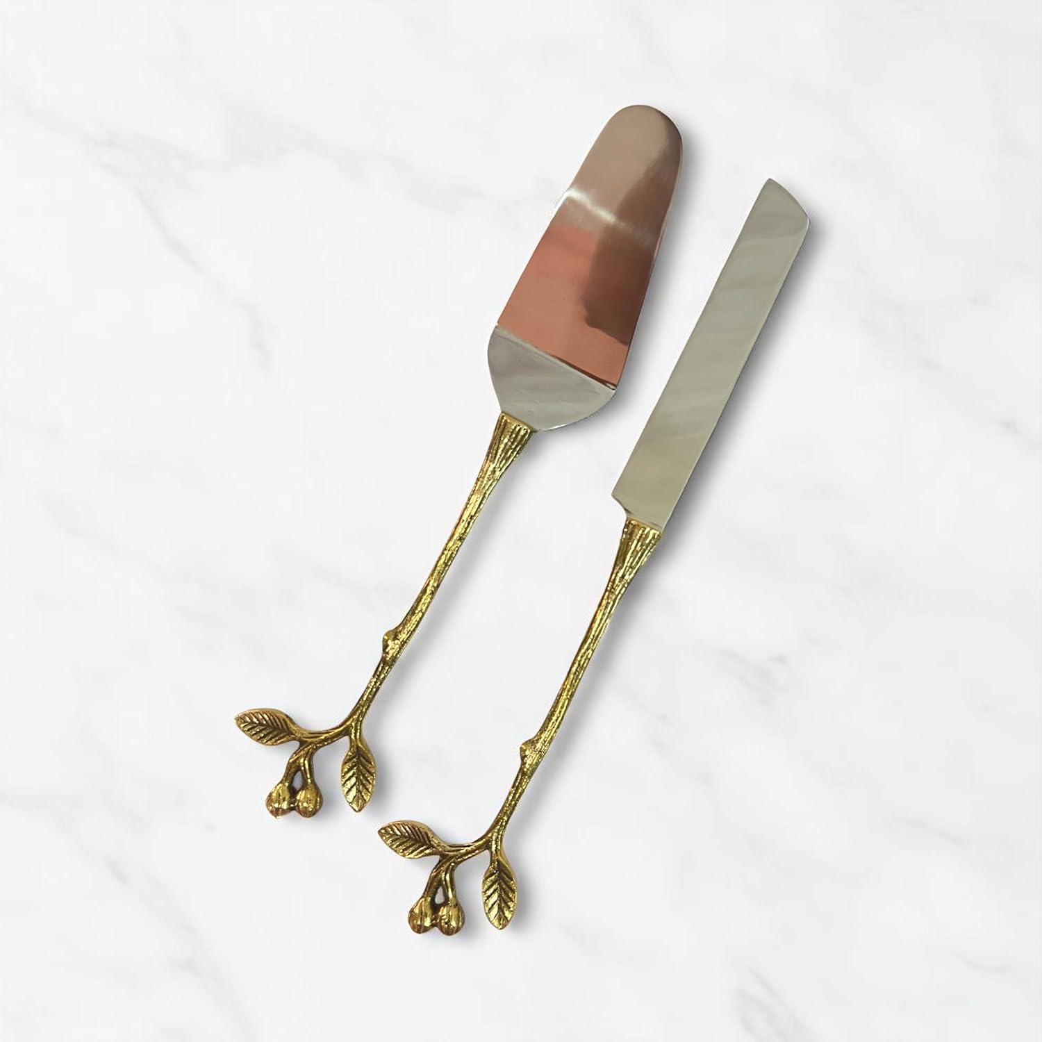 Add a touch of vintage elegance and botanical charm to your special moments with the Morcomart Brass Cake Knife and Server Set. This beautifully handcrafted 2-piece set features stainless steel blades paired with exquisite floral bud and leaf brass handles, bringing artful sophistication to your dessert presentation. Designed for cake cutting and serving at weddings, anniversaries, housewarmings, and other celebrations, this set blends form with function. The handles are cast in solid brass with natural textures, evoking blooming buds on golden stems – perfect for romantic themes. Made by skilled artisans in India, this piece reflects fine craftsmanship and makes an elegant heirloom or premium gift. Durable, easy to clean, and designed to impress at every celebration.