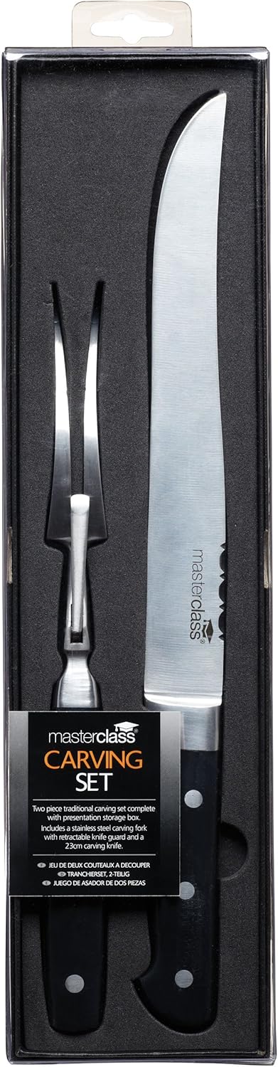 Product Description The Master Class Deluxe Stainless Steel Meat Carving Set is all-in-one carving toolkit. It includes a premium-quality carving fork and knife, everything you need to effortlessly slice and serve the Sunday roast, Christmas turkey or barbecued meat joint. These essential carving tools are crafted to Master Class’s exacting standards. The are designed to be sturdy, safe to use. In other words, they’re robust enough for everyday use and ideal for dinner party presentation. Robust and Balanced Holding the knife and fork steady as you serve is easy. They both feature full-length tangs and riveted handles for impressive strength, comfortable balance and maximum control. The knife blade and fork prongs are made of robust stainless steel, which is designed to last for years without tarnishing or breaking. Taper-Ground Blade The carving knife features a taper-ground cutting edge. This makes it easier to achieve a precise cut every time. The handle is moulded to follow the shape of the blade exactly, so it would not trap food when cutting. Built-in Safety Guard The carving fork's twin-pronged design makes it really simple to hold your meat or poultry steadily in place, as you carve with the knife's sharp blade. And to protect your hands from the sharpened blade, it features a built-in retractable safety guard. This is especially useful for situations where you have to carve with the blade pointing towards you. Useful Information - includes a 23 cm (9 inch) carving knife and a 13.5 cm (5.5 inch) carving fork - hand-wash only Manufacturer's Description The carving fork has a built in retractable knife guard and the 19cm carving knife has a taper ground plain cutting edge, a full length tang and stainless steel rivets. Display boxed making it ideal for own use or gift purchase. Box Contains 1 x Master Class deluxe carving knife, 23 cm (9") 1 x Master Class deluxe carving fork, 13.5 cm (5½") See more.