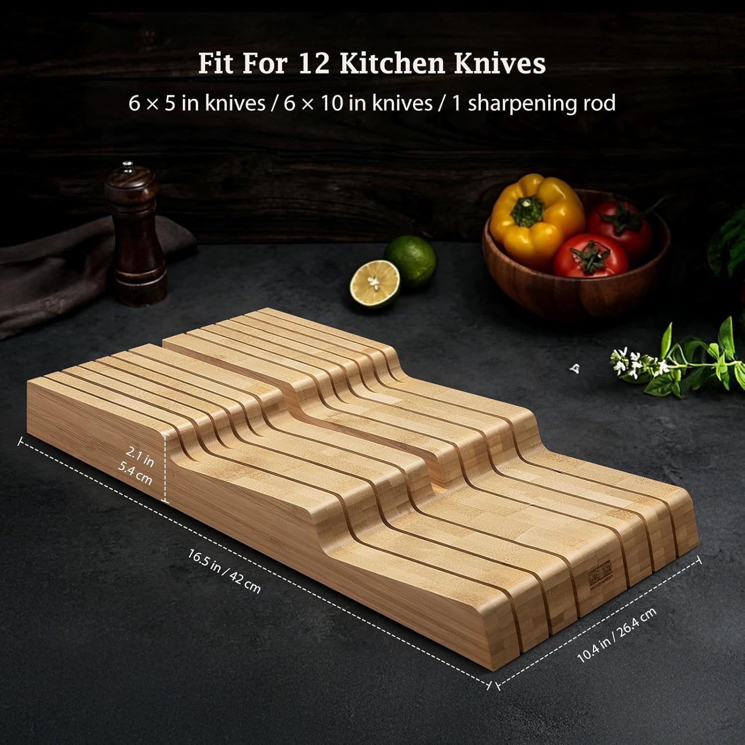 HOSHANHO In-Drawer Knife Block, Large Bamboo Knife Drawer Organizer for 12 Knives & Steak Knives Set of 6, Ultra Sharp 4.5 Inch Professional Non Serrated Steak Knife Set for Precise Cutting
