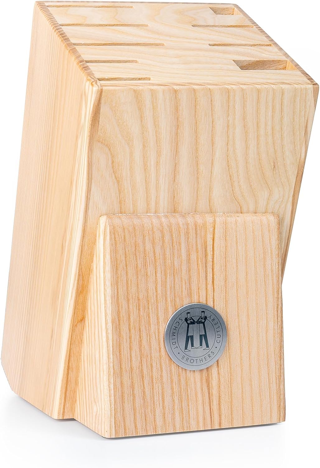 With beautifully beveled edges and an angled face for easy access to your favorite blades, the Schmidt Brothers Hometown universal knife storage block redefines home organization for your kitchen. Free up drawer and counter space by neatly storing up to 9 pieces: 7 knives, kitchen shears, and an honing rod. The horizontal knife slots help prevent gravity's wear and tear on your knife edge so your favorite knives stay sharp.