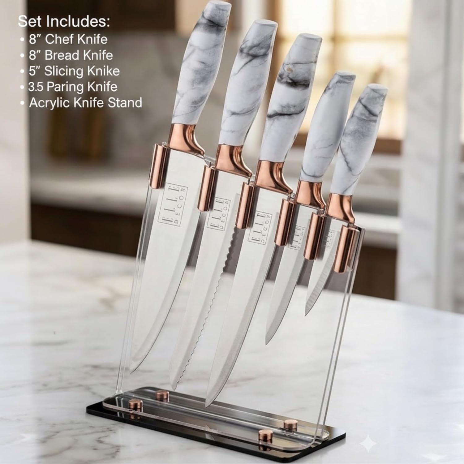 From Elle Decor, this knife block set offers any kitchen the exceptional quality and performance that usually only comes with professional level equipment. Each of the 5 knives in this block set provides effortless slicing for the full range of kitchen ingredients and foods. The marbled handles complete the design with a beautiful aesthetic that elevates the set into an eye-catching part of your own beautiful kitchen Includes 5 knives and storage block Professional qualityMarbled handlesMakes an amazing gift10.25 x 13.75 x 3.5