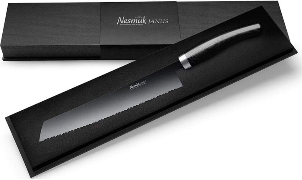Perfect For All Kinds Of BreadBread is an important staple food in many countries of the world and enjoys a high status. In Europe in particular, bread is considered a cultural asset. This can also be seen in the incredible variety of bread types. This diversity results in special requirements for a bread knife.Double Serrated EdgeTwo differently shaped teeth ensure a comfortable cut through all types of bread. In addition, the serrated edge has been designed to be gentle on the cutting surface and less scratching.Dlc-CoatingIn contrast to the other JANUS models, the blade of the bread knife is also coated. Since the 2µm thick DLC layer does not influence the cutting function of the serrated edge, this increases the durability of the serrated edge. The DLC coating is approximately three times harder than the steel.Specifications:Blade: 180 mm, Niobium steel, 60 HRC, single-sided hollow grind, DLC-CoatingFerrule: Polished stainless steelIncluded: High-quality matt black cardboard box, certificate of authenticityModel: JBBR260, JBC260, JBEM260, JBJB260, JBJI260, JBME260, JBMB260, JBZE260