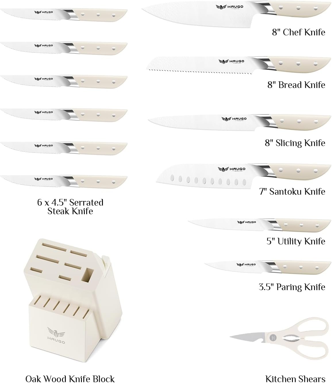 | Included Components | 14-piece complete set covers 90% of everyday kitchen tasks., 8" chef knife, 8" slicing knife, 7" santoku knife, 8" bread knife, 5" utility knife, 3.5" paring knife, six 4.5" steak knives, kitchen scissors, and a premium oak knife block with built-in sharpener., Optimized knife block design frees up 65% of kitchen storage space., Premium gift packaging – enhances perceived gift value by 320%. |