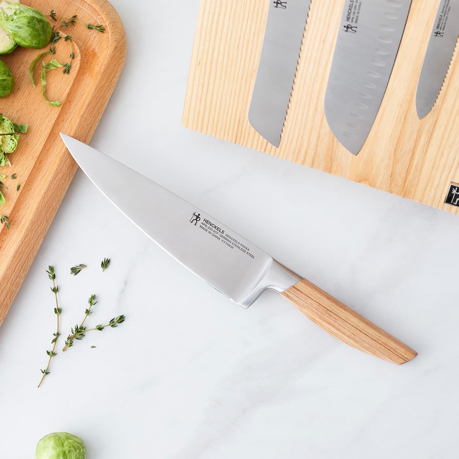 | Included Components | 3.5" Paring Knife, 5" Serrated Utility Knife,, 7" HE Santoku Knife, 8" Bread Knife, 8" Chef Knife, Ash wood Easel - Natural Color, knife block |