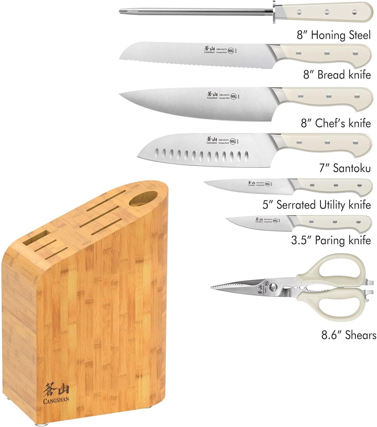 Cangshan APERTIVO Series 8-Piece Knife Block Set German Steel, Bamboo Block, 1026849 (White)
