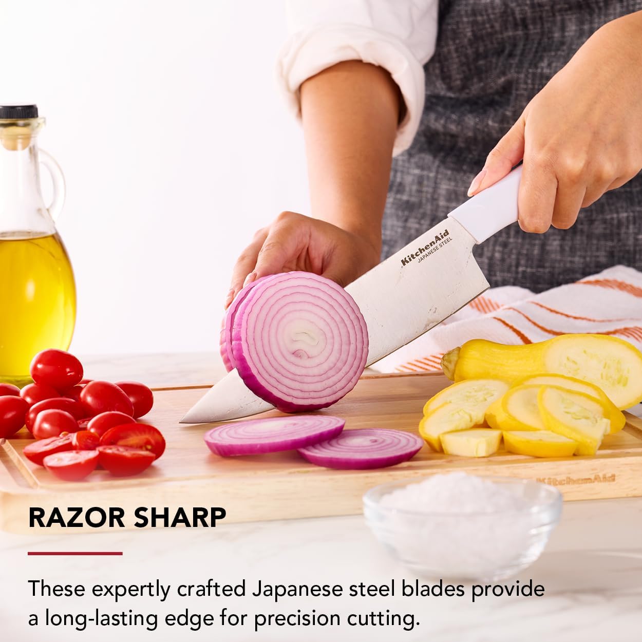 This KitchenAid 14-piece Knife Block Set offers all the essential tools for everyday food preparation tasks, including slicing, cutting, chopping, mincing, and trimming. The set includes an 8-inch chef knife, an 8-inch slicer knife, a 5.5-inch serrated utility knife, a 5-inch santoku knife, a 4.5-inch fine-edge utility knife, a 3.5-inch paring knife, a 3.5-inch serrated paring knife, six 4.5-inch steak knives, and a natural rubberwood storage block with a built-in knife sharpener. Crafted from semi-polished, high-carbon Japanese steel, the blades are expertly hardened and tempered, ensuring long-lasting sharpness and professional-quality cuts with each use. These KitchenAid knives feature Eastern-style ergonomic white handles, providing optimal control and comfort for everyday tasks, accented with a stylish chrome endcap. The natural rubberwood storage block includes a built-in sharpener for effortless maintenance. These KitchenAid knives are dishwasher safe on the top rack for convenient cleanup, though hand washing is recommended for extended longevity. Dry immediately for best results.
