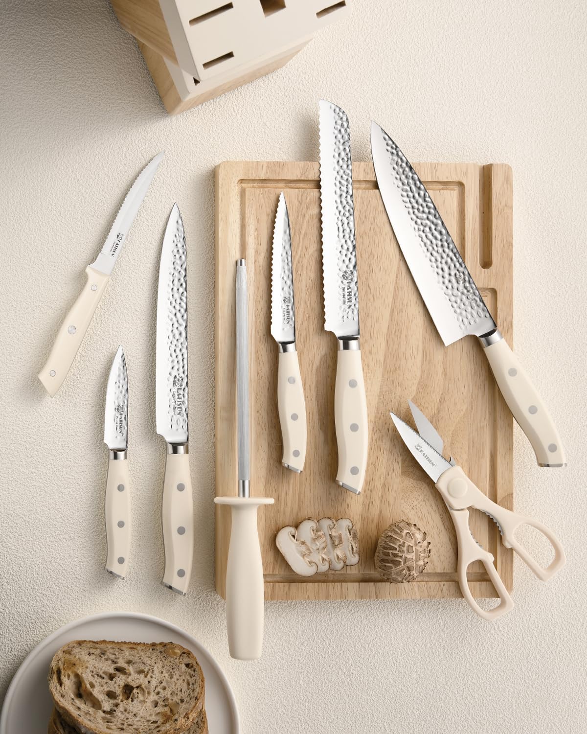| Included Components | 3.5”Paring Knife, Kitchen Scissors, 6 piece 4.5”Steak Knives and a wooden knife block, 8”Bread Knife, 5”Utility Knife, 8”Chef Knife, 8”Slicing Knife, 8”Kitchen Sharpener Rob |