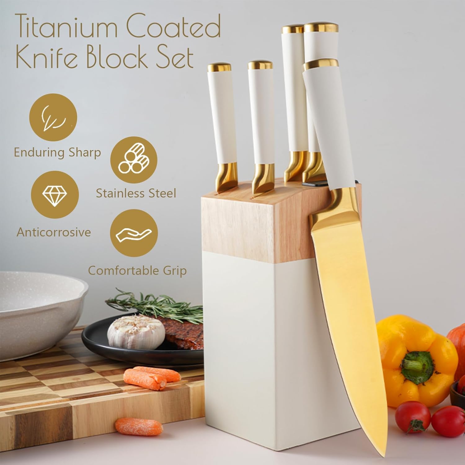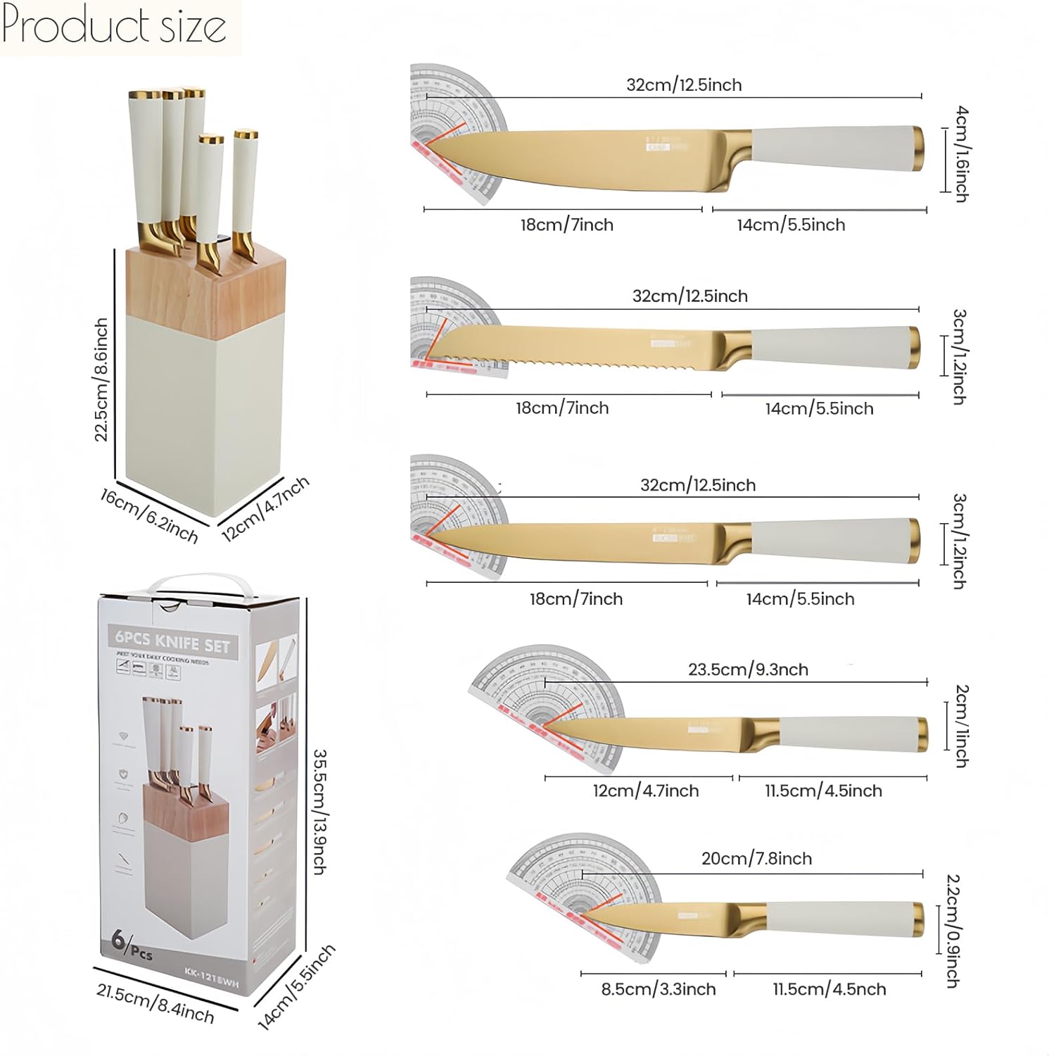 Good Choice --The 7-piece golden blade set features a titanium coated thick blade design that maintains optimal sharpness and non stick properties every time it is used. Equipped with stylish wooden knife blocks in pink/white color matching, embellish your kitchen and enhance aesthetics. This is a set of all the tools you need to cut, chop, slice, and diced when cooking. Specifications: Style:Modern&minimalist Material: Stainless steel,Wood Color: Pink/White Weight: 2kg Quantity: 7PC Function: Chopping vegetables, meat, bread, fruit Product Size: 7" chef knife, 7" bread knife, 7" slicing knife,4.7" utility knife, 3.3" fruit knife, 8.9" knife block Package Includes: 1* Chef Knife 1* Bread Knife 1* Slicing Knife 1* Utility Knife 1* Fruit Knife 1* Knife Block Warm Tips: 1.Wipe off the blade after cleaning to prevent from rusting. 2.Hand washing is recommended in order to keep the blade edges sharp. 3.Please don't touch the blade with your hands to test its sharpness. Excellent after-sales service: Please feel free to contact us if you have any problems about our product as soon as possible. We will reply and solve your problem within 24 hours.