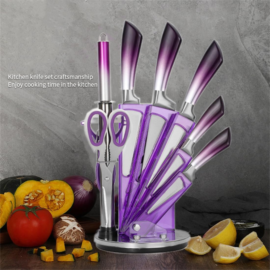 Gradual Color Changing Knife Set 9 Pcs Stainless Steel Knives Set with Acrylic Storage Sharp Cutlery Knife Block Set Chef Cooking Cutting This professional knife set includes: 1 PCS Chef Knife 1 PCS Large Blade Cleaver Knife 1 PCS Bread Knife 1 PCS Utility Knife 1 PCS Paring Knife 1 PCS Peeler 1 PCS Scissors 1 PCS Rotatable Acrylic Stand +1PCS Knife Sharpener Stick The knife holder is stored to save kitchen space. This perfect knife set can meet all kinds of needs of your daily kitchen life. Sharp Knife Set: This professional chef's knife adopts precision blade technology, which makes the stainless steel blade sharp enough to be easily used for any type of cutting in the kitchen.