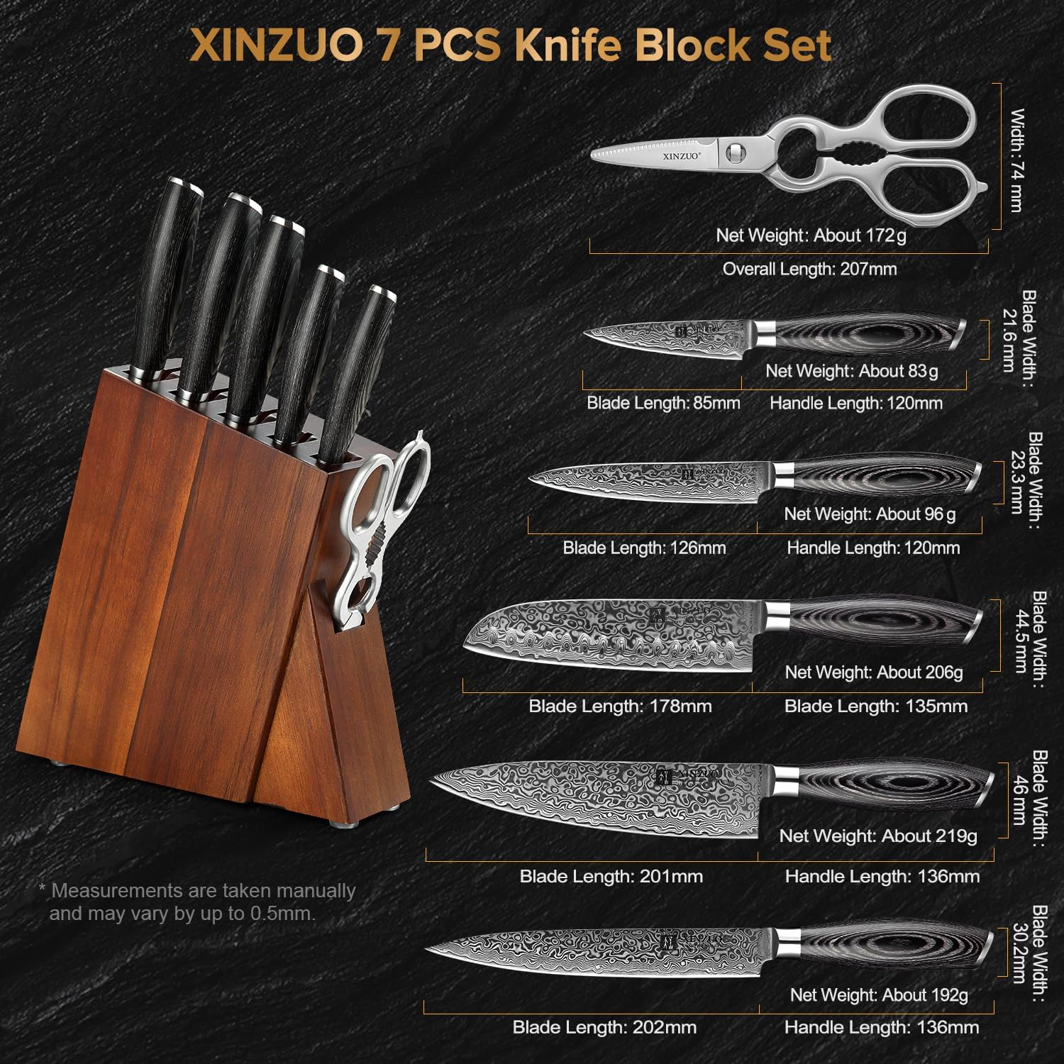 | Color | 7PC Damascus Steel Kitchen Knife Set with Acacia Wood Block,Multifunctional Kitchen Scissors |