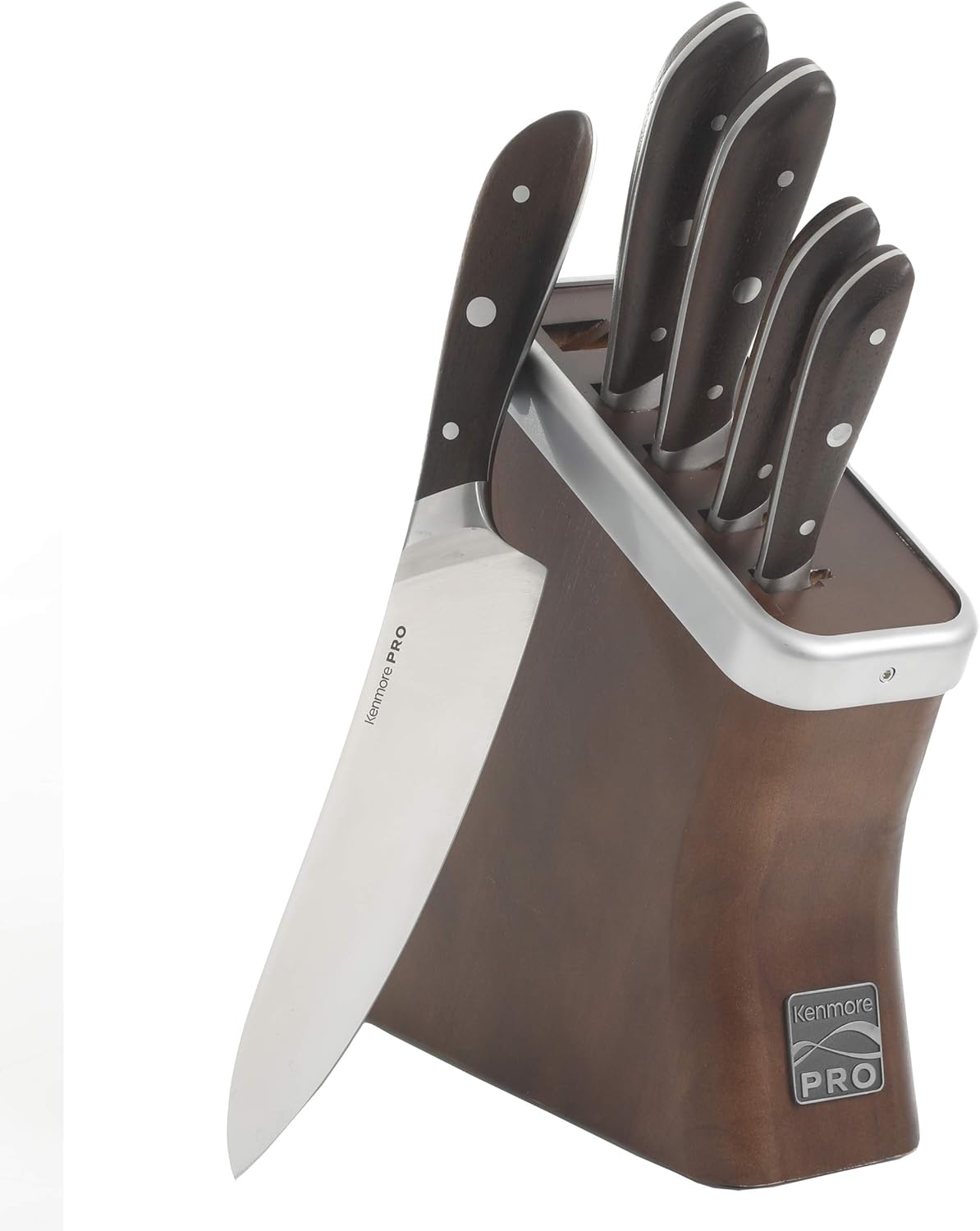 The Kenmore Pro Truman 6-Piece Stainless Steel Cutlery Set includes essential professional-quality knives you need for everyday cooking. Comes with five knives: chef’s knife, bread knife, carving knife, serrated knife, and paring knife, as well as a heavy rubber-coated pine wood block to store them— all featuring richly-hued walnut wood. Made from high quality stainless steel and sharpened against a diamond wheel, the full tang knives in this set provide exceptional sharpness. Sturdy ergonomic handles with bolsters help safe, precise cutting. And everything stores securely in a storage block that looks great on your kitchen counter. Experience cutting edge performance with Kenmore's Truman 6-Piece Stainless Steel Cutlery Set. Perfect for veteran chefs or others simply looking to expand their culinary palate, the Kenmore Truman 6-Piece stainless steel cutlery set performs under pressure and delivers delicious results.