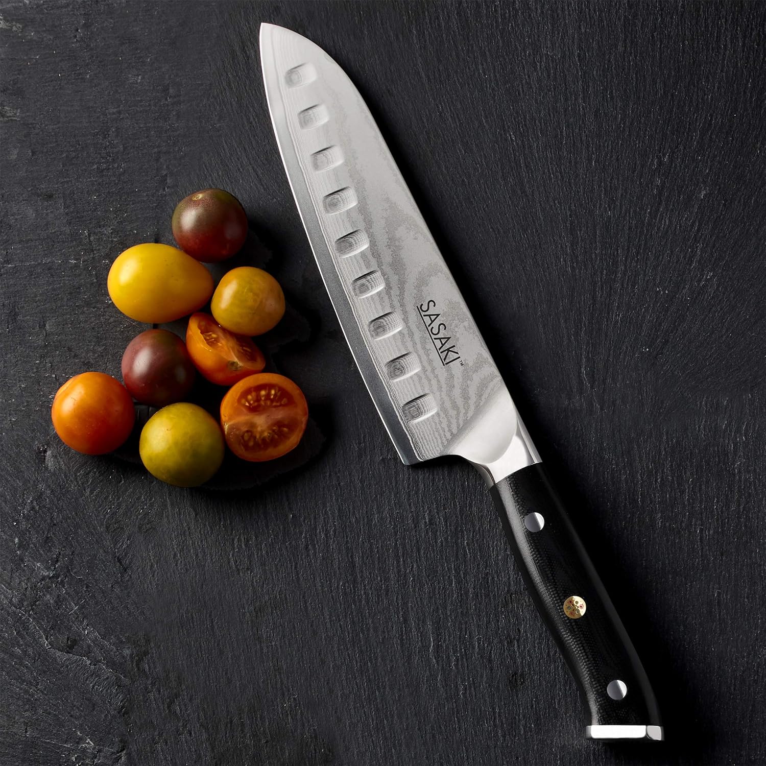 Steeped in Japanese tradition, the stunning look and refined style of Sasaki Cutlery is the result of a 60-day process that is intensively implemented and overseen. Only premium materials are used in creating each knife. The blade is precision forged from a single 67-layered Damascus high-carbon stainless steel piece (The cladding) with a cutting core made of Japanese aus-10 “super steel. ” this vastly increases the Steeler’s strength, flexibility, and hardness, it is heated at 1000 degrees Celsius, then cooled down to 200-300 degrees Celsius. This treatment results in an incredibly durable, stain and corrosion resistant blade that delivers incomparable performance and outstanding edge retention. Giving the blade a razor-sharp edge is an exhaustive procedure of coarsely grinding, fine-honing, then polishing it to a mirror finish within an astounding 15-degree angle on each side, using a sand wheel that must be monitored and manually adjusted countless times throughout the process. The task is not complete until we have produced a visually arresting, powerful kitchen essential. The bolster is the juncture where the blade meets the handle, providing a counterbalance between the two for stability in your hand. On the Sasaki knife, the bolster is specifically designed and weighted to encourage a proper pinch grip – The correct form when holding The handle. It is also mirror polished to create a spectacular, glimmering focal point at the center of the knife. The handle is expressly engineered so you feel the power of the cutting process with each chop, slice, and dice. The handle is constructed of fiberglass, which is exceptionally durable and highly corrosion resistant. It is full tang (meaning, the steel of the blade runs all the way through the handle rather than simply attaching at the bolster), and triple riveted for superior stability and strength. Each knife includes a premium quality Japanese Saia (sheath) embossed with the Sasaki logo. A pin lock secures this protective cover on the blade, keeping it safe when not in use. To keep your Sasaki Cutlery at peak performance, we highly recommend using only a traditional sharpening stone to hone your knives. Hand-wash with warm water and a mild detergent; rinse and dry immediately.