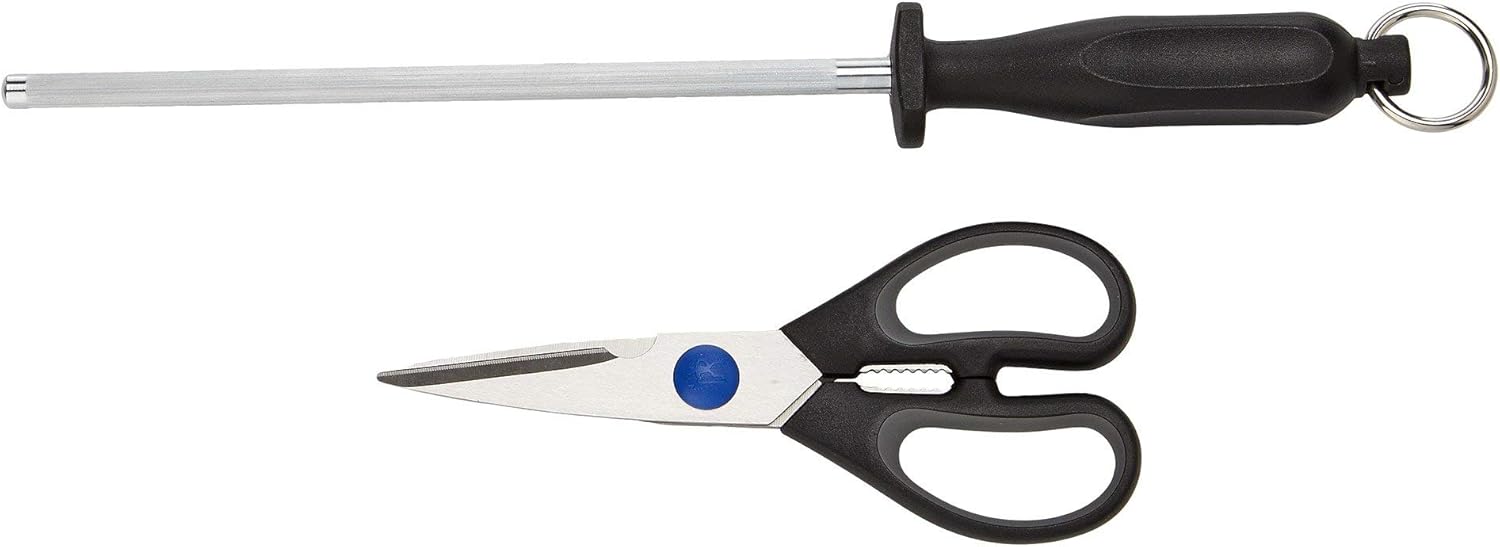 J.A. Henckels International 13550-005 Statement Knife Block Set, 15-pc, Light Brownp>The Henckels International Statement 15-pc Knife Block Set is stocked with tools to easily tackle your kitchen tasks. Honed for long-lasting sharpness, the fine-edge blades boast precision cutting. The all-rounder 8" Chef's Knife is perfect for chopping herbs and dicing onions and the 8" Bread Knife cleanly slices through crusty sourdough. Efficiently mince garlic with the 7" Hollow Edge Santoku, whose blade has small indentations, aka grantons, that prevent food from sticking while cutting.Fabricated from durable, high-quality stainless steel, Statement's single-piece, stamped blade construction is lighter than forged knives. Along with the full tang, this encourages maximum maneuverability. The traditional triple-rivet handles are curved for comfort and balance while the stainless steel endcap adds aesthetic appeal to your block display. Each time you cook, you will want to reach for this useful knife set.Henckels International makes essential kitchen tools every home chef needs. From steak knives to spatulas, each product boasts high quality at an exceptional value. Created in 1895 by Zwilling J.A. Henckels, this value-driven brand guarantees the same durability, design and ease of use for which the global company is known. Equip your kitchen with expertise with Henckels International.KitchenIQ 50009 Edge Grip 2-Stage Knife Sharpener, BlackSmall Size, Big ResultsDon't let the small size of this cutie fool you. This pint size tool is a work horse in the kitchen. Use it to quickly and easily sharpen your favorite knife in the comfort of your own home. Use the KitchenIQ Edge Grip to quickly sharpen your damaged and dull knives and for everyday knife maintenance. This gem sharpens damaged and dull knives with just a few pulls through the coarse slot. This slot includes carbide blades at preset angles to quickly bring a dull knife back to life. Then quickly finish and polishes the knife edge with just a few pulls through the fine slot. The Edge Grip’s small size is ideal for storing in your knife drawer and for anyone with a small kitchen or little storage space.Work Smarter in the KitchenWho doesn’t want to work smarter in the kitchen? A great tip to remember is to keep your knives sharp. Don’t let them go dull. The Fine slot on the Edge Grip is ideal for regular knife maintenance with its gentle ceramics. These ceramics will polish the knife edge and keep it sharp. So run the knife through this slot every time you use the knife. A sharp knife definitely speeds up prep work in the kitchen.Edge Grip Feature Gives More Flexibility when SharpeningThe Edge Grip is designed with a unique feature called “edge grip. ” What does this mean? Well the bottom of the sharpener has been designed to allow the sharpener to rest on the edge the counter top or table. Why is this helpful? Sometimes when you sharpen a large chef’s knife with a smaller sharpener, you might drag the tip of the knife across the counter top. This can damage the knife or worse the countertop. So sharpening on the edge with the edge grip allows the knife to pull through the slots from heel to tip. Of course you can still use the Edge Grip on top of the surface but isn’t it nice to have flexibility when sharpening if you need it? The bottom is made of a non-slip material that allows for safe and sturdy sharpening.KitchenIQ Edge Grip FeaturesUnique design sharpens straight edge double-beveled Euro / American style knives.Two stages of sharpening, in one small compact unit at a great value!Coarse sharpening slot includes carbide blades that quickly sharpen dull or damaged knives with just a few pulls.Fine slot’s ceramic rods are ideal for finishing and polishing the edge, and are perfect for light touch-ups to an already sharp knife.Edge Grip Bottom allows stable sharpening on the counter top or edge of the counter top or table.Designed in the USA by Smith’s Consumer Products, Inc. the Edge Experts Since 1886.Stainless steel and soft touch accents.