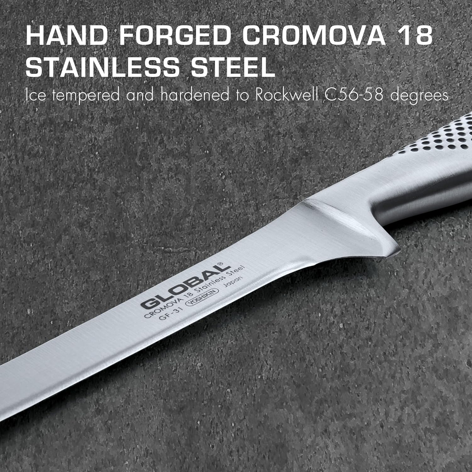 Product Description "Debone a rack of ribs with this forged boning knife from Global. This knife is made from a single piece of high quality CROMOVA 18 stainless steel. The pointed tip and narrow blade make it easier to go around the bone for more precise cutting. The ice hardened, convex edge can hold a sharper edge for a longer time. With this sturdy knife you can debone and skin a cut of beef easily to make spare rib tips for the family. It has an ergonomic handle with a dimple pattern making it comfortable and slip resistant, useful for repetitive slicing. The knife’s perfect weight is achieved through the hollow handle that is filled with sand for ideal balance.6-1/4" L High tech from tip to handle, Global knives from Japan created a sensation when they burst onto the world's culinary stage as an alternative to traditional European-style cutlery. Blades are made of hard molybdenum/vanadium stainless steel and "face-ground" with a long taper rather than a short bevel so edges remain sharp longer than even the best high-carbon stainless-steel knives. Edges also are ground at a more acute angle than traditional European-style knives and arrive from the factory razor-sharp. Although Global's original knives have thinner blades and are lighter than traditional European-style knives, Global also makes a "heavyweight" line for cooks who prefer hefty cutlerylike this 6-1/4-inch boning knife, whose stiff blade is as thick as a traditional European knife's and ideal for meat and poultry and cutting through joints. Global also dispensed with bolsters on most of its knives, although this knife has one. Most Global knives have hollow handles, but the handle on this knife is solid. Stainless-steel handles are Global's most striking feature. They're molded to fit the hand and dimpled to resist slipping. Smaller around than many European-style handles, they're easy for small-handed cooks to grasp and seamless for sanitation. Global recommends using a ceramic sharpener or a diamond steel instead of a metal sharpening steel for its knives, supplemented by a synthetic whetstone, a ceramic whetstone, or a Shinkansen sharpener. Global also makes a Sharpening Guide Rail so blades can be honed on a whetstone at the proper angle. Global knives should be hand washed to protect edges. They carry a lifetime warranty against defects and breakage. Fred Brack " Amazon.com High tech from tip to handle, Global knives from Japan created a sensation when they burst onto the world's culinary stage as an alternative to traditional European-style cutlery. Blades are made of hard molybdenum/vanadium stainless steel and "face-ground" with a long taper rather than a short bevel so edges remain sharp longer than even the best high-carbon stainless-steel knives. Edges also are ground at a more acute angle than traditional European-style knives and arrive from the factory razor-sharp. Although Global's original knives have thinner blades and are lighter than traditional European-style knives, Global also makes a "heavyweight" line for cooks who prefer hefty cutlery--like this 6-1/4-inch boning knife, whose stiff blade is as thick as a traditional European knife's and ideal for meat and poultry and cutting through joints. Global also dispensed with bolsters on most of its knives, although this knife has one. Most Global knives have hollow handles, but the handle on this knife is solid. Stainless-steel handles are Global's most striking feature. They're molded to fit the hand and dimpled to resist slipping. Smaller around than many European-style handles, they're easy for small-handed cooks to grasp and seamless for sanitation. Global recommends using a ceramic sharpener or a diamond steel instead of a metal sharpening steel for its knives, supplemented by a synthetic whetstone, a ceramic whetstone, or a Shinkansen sharpener. Global also makes a Sharpening Guide Rail so blades can be honed on a whetstone at the proper angle. Global knives should be hand washed to protect edges. They carry a lifetime warranty against defects and breakage. --Fred Brack
