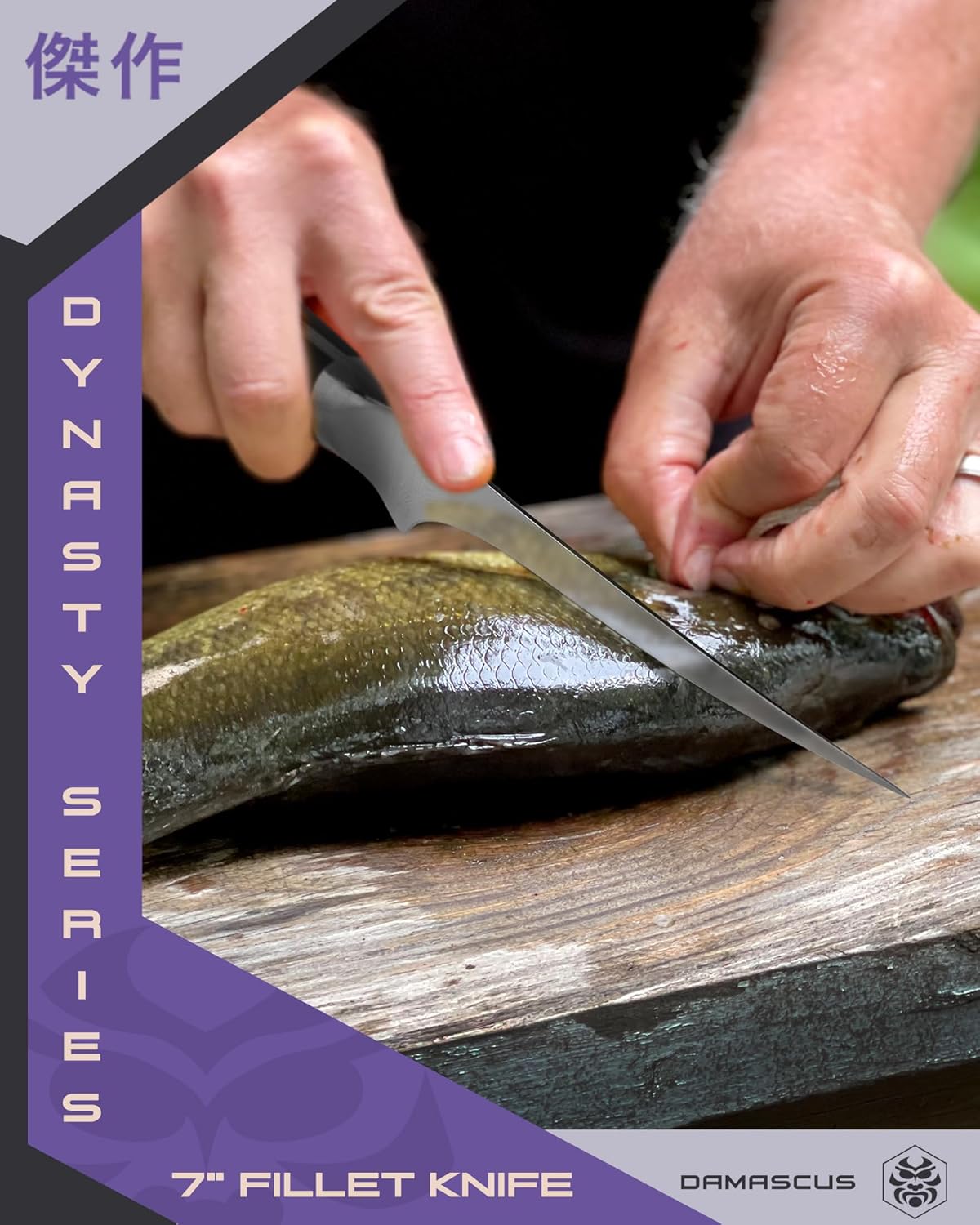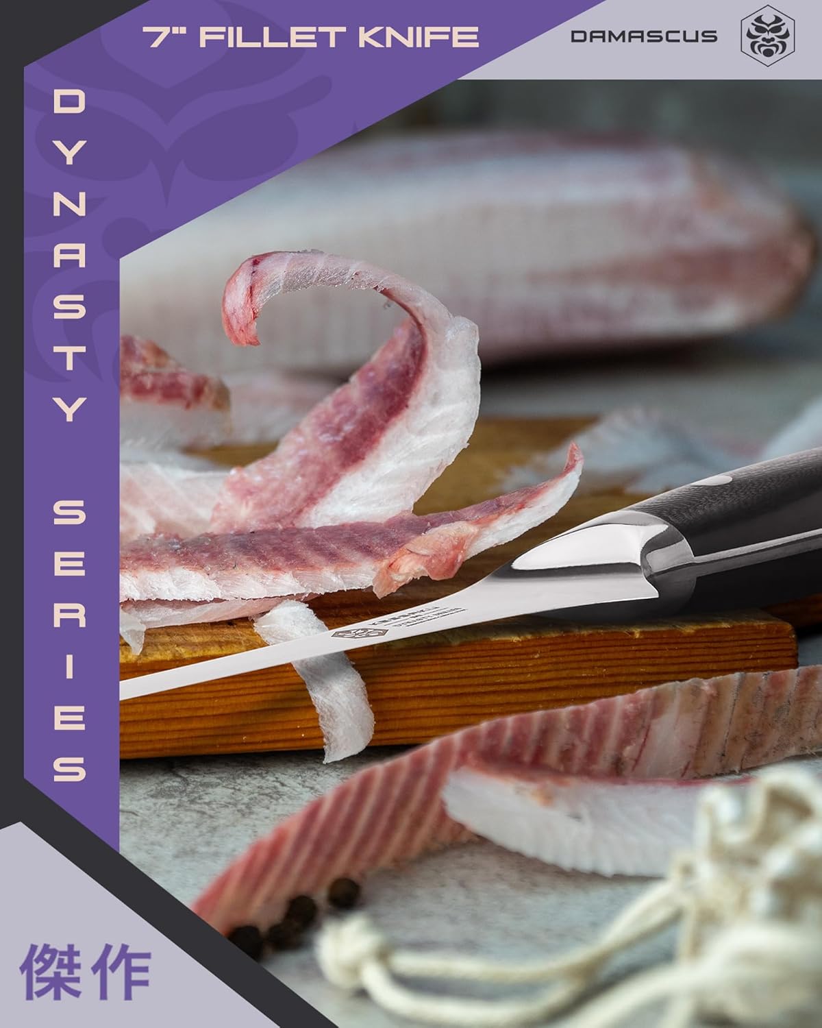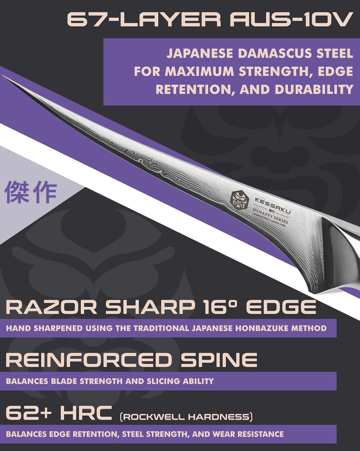 | Included Components | Kessaku 7" Damascus Dynasty Series Fillet Knife, Kessaku Care Instruction Booklet, Kessaku Custom Blade Guard, Kessaku Polishing Cloth |