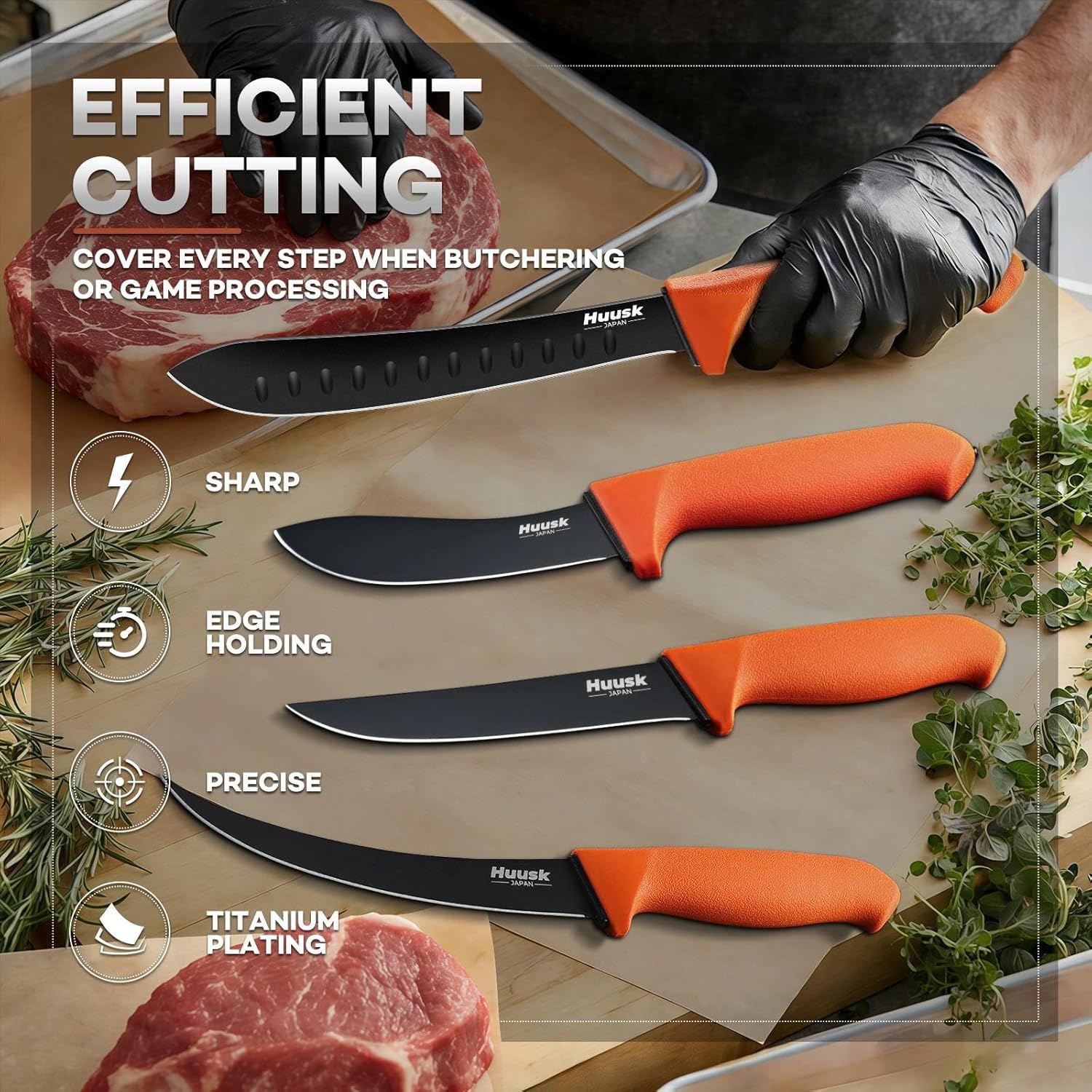 Huusk 5-Piece Butcher Knife Set - Japanese Knives for Meat Cutting, Non-Slip BBQ Knife Sets for Camping, Ideal Gift for Men