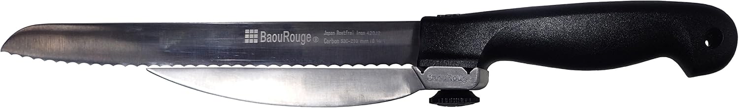 This 8 1/4" Right-Hand Precision Slicing Knife is made specifically for right-handed users. This is the result of a Kickstarter Projet based on re-creating the famous French-made 1968' DUX slicing knife at a fraction of the cost of its modern equivalent. This knife has a adjustable titanium coated aluminum guide that is very strong, rigid and light-weight. With Kickstarter, we improved the ergonomics of the handle but left the other elements of the DUX' 1968 intact. It features a stamped stainless steel blade with a serrated edge and an ABS plastic curved handle. This item easily disassembles for machine or hand washing. Warranted quality that will last for years!