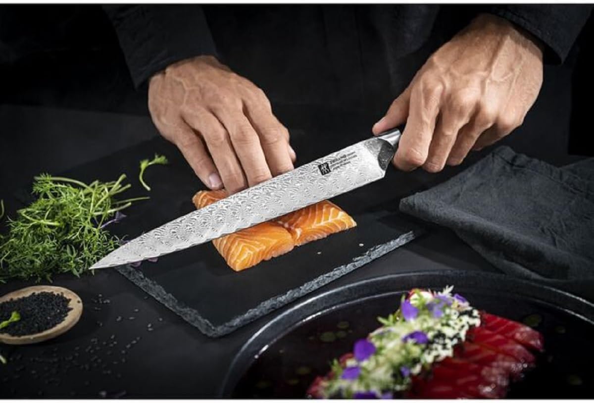 Zwilling TANREI carving knife 23 cm This knife is suitable for fine and pulling cuts. Thus, any cutting material can be cut from meat, but fish can also be precisely cut into even discs. The damask pattern on the blade is created during production and is as individual as a fingerprint. Features: - Colour: black/silver. - Blade material: steel. - Handle material: plastic. - Blade with damask pattern. - Blade length: 23 cm. - Balanced and comfortable. Technical data: Type: Type: Carving knife General. - Colour: black/silver. - Blade material: steel. - Handle material: plastic.