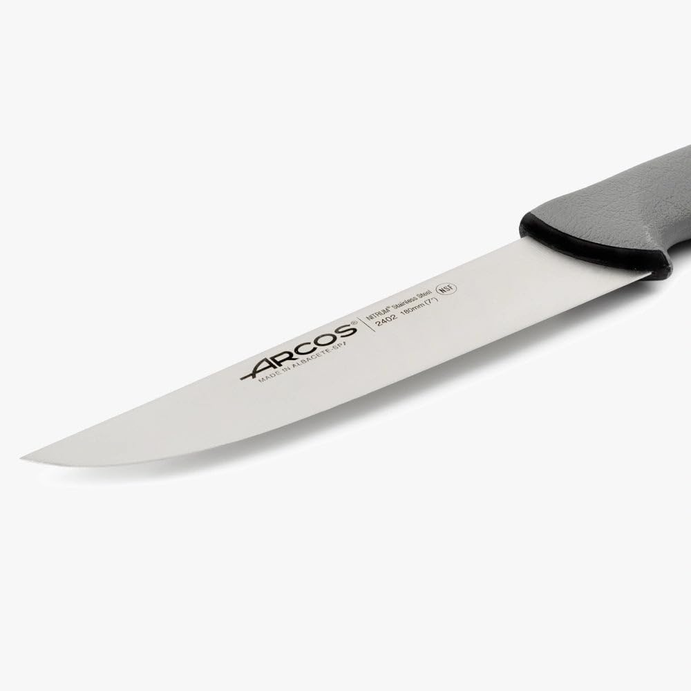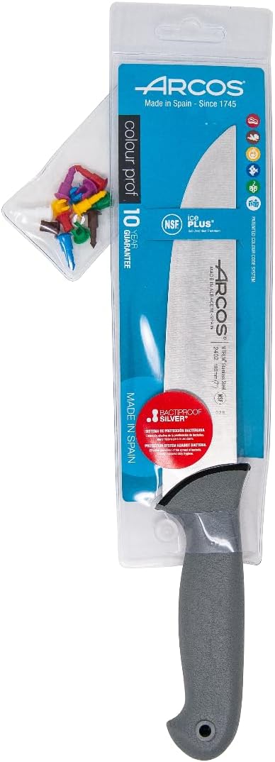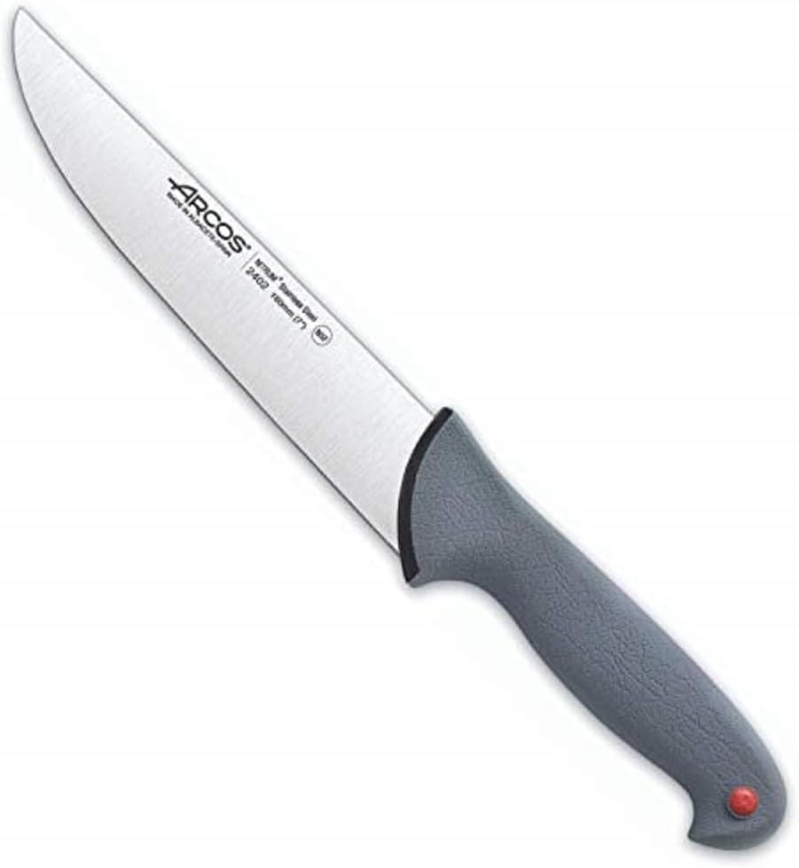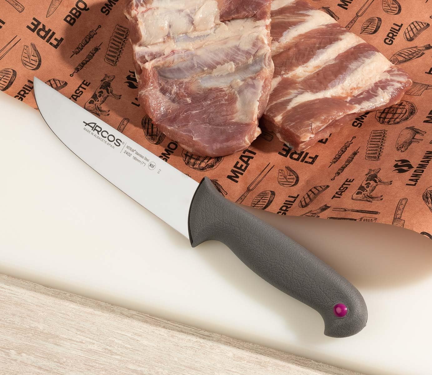 ARCOS leading European knife manufacturer, introduces Colour-Prof series, unique patented professional colour coded range of knives 100-percent made in Spain since 1745. Specially designed for cutting meat , the Arcos Colour Prof 7-inch butcher knife uses a revolutionary ergonomic handle made of inner polypropylene (PP) covered with soft rubber coating which provides greater comfort and a perfect grip. It is non –hygroscopic, resistant to high temperatures and non slippery. The colour prof range provides a colour identification system which allows each knife to be identified for cutting a specific food, thus promoting better hygiene and health for the consumer.. Blade made of hardened Nitrum stainless steel. Originally Arcos produced knives exclusively for the professional. Due to its high cutting power (over 100 mm) and long edge retention (over 350 mm) which made Arcos knives leader in the commercial market, now Arcos professional knives are also available for the end users that wants to feel in theirs hands a precise cutting tool used by professional chefs worldwide