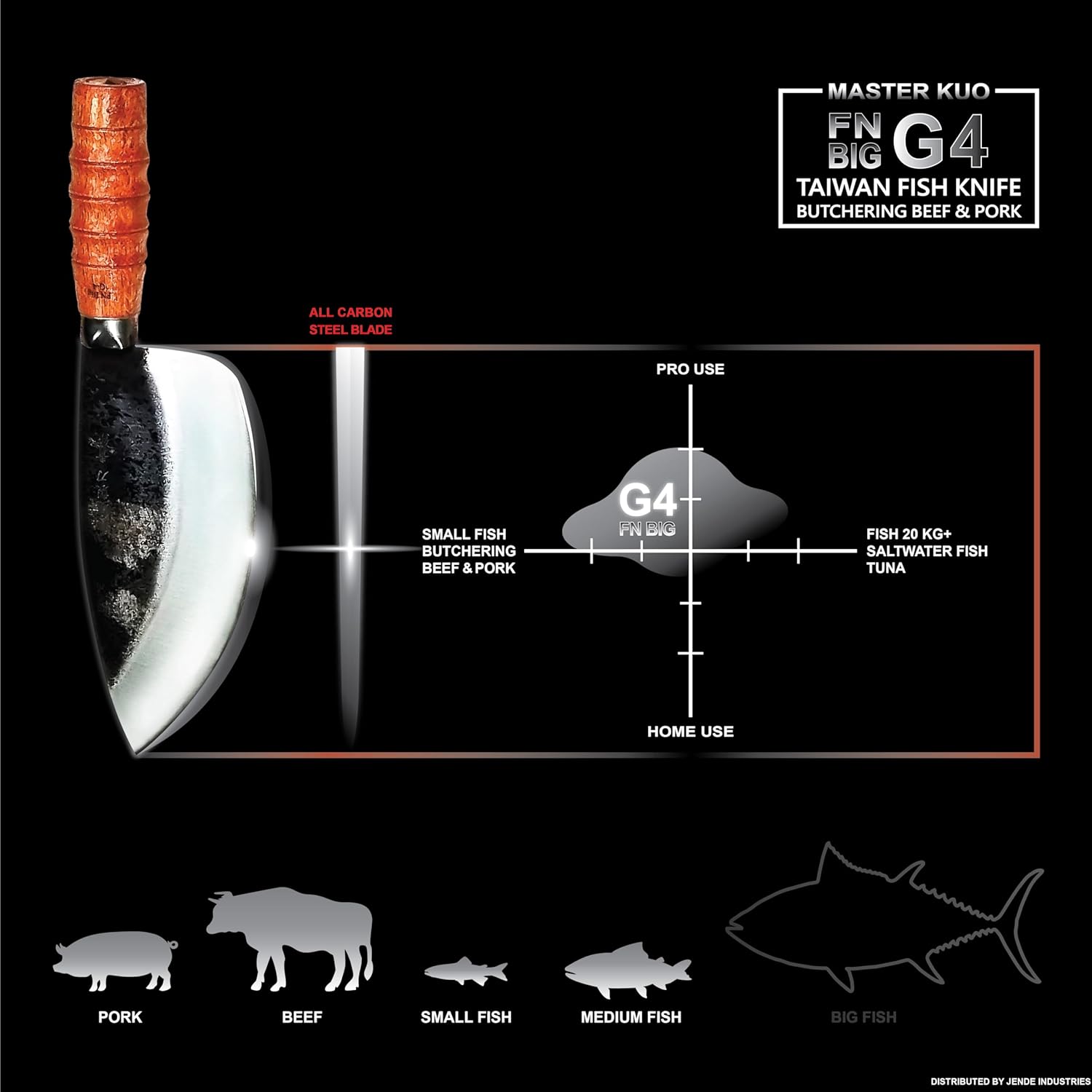 Master Kuo's G-4 Medium Fish/Butcher's knife is designed for cutting medium sized fish with bones, and is often used in the traditional markets as a butchering knife for separating the fat layers from meats. The blade can also be used to scrape the scales off the fish. This G4 Medium Fish knife is made with 3 layered laminated steel. The outer steel is stainless while the inner core steel is a traditional Japanese High Carbon SK5 steel. Stainless clad outer steel will not rust, but exposed SK5 core edge steel can show signs of surface rust over time. Most surface rust can be removed by sharpening the edge. Kuo Chang-Shi is most famous for forging the original Green Sword of Destiny from the 2000 movie "Crouching Tiger, Hidden Dragon". His Damascus steel designs incorporate human bones and ashes to imbibe the spirit into the piece, as well as to add some elemental strength to the steel (such as manganese and phosphorus), which is based on historical accounts in ancient Chinese sword making.