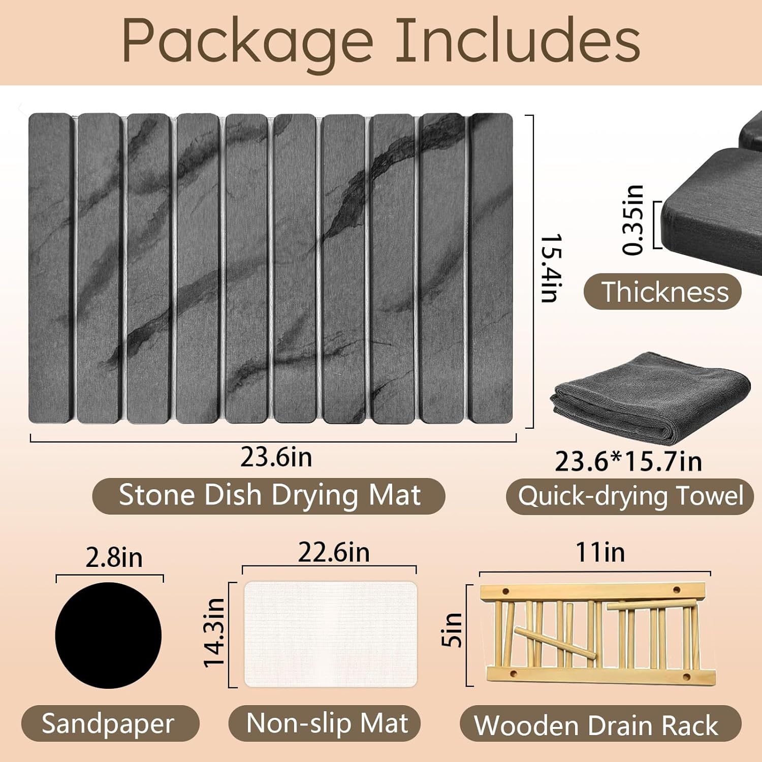 | Included Components | Stone Dish Drying Mat 23.6"×15.4" *1, Wooden Drain Rack 11"×5" *1, Microfiber Absorbent Towel 23.6"×15.7" *1, Non-slip Mat *1, Sandpaper *1, Instructions *1 |