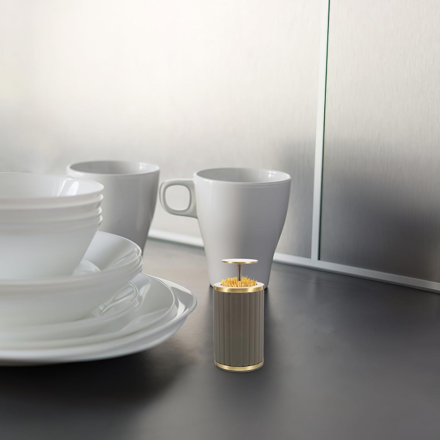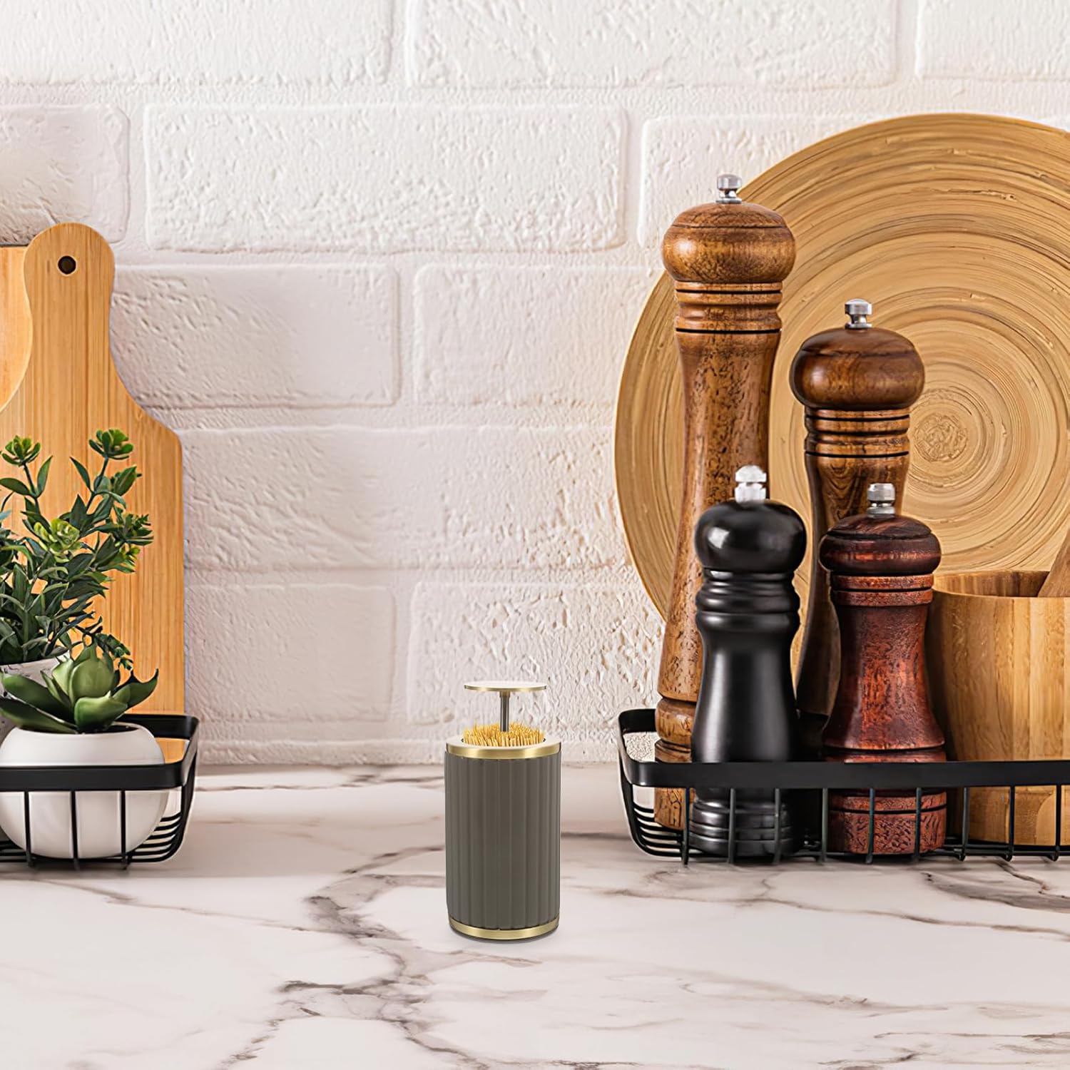 Package List 1 x Toothpick Holder Characteristics - design: with aesthetically pleasing toothpick holder that showcases your refined taste toothpicks holder dispenser -Versatile use: ideal for home, office, or travel, this toothpick holder addresses food residue between teeth in any setting tooth pick dispenser automatic -Unique shape: stand out with a distinctively designed toothpick holder that reflects your personal style and sophistication toothpick dispenser -Automatic ejection: effortlessly retrieve toothpicks with a simple press, saving you time and making the process more convenient automatic toothpick -Size:10.20X6.00X6.00cm/4.01X2.36X2.36in reusable toothpick holder -Material:Brass, leather reusable toothpick -Portable convenience: compact and lightweight, this toothpick holder is for use, ensuring oral clean wherever you are toothpick holder with lid -Color:Grey toothpick holder creativeGoods Descriptiondesktop toothpick holder This automatic toothpick dispenser is for any home setting.tooth pick With its sleek and design, it adds a touch of elegance to your dining table or kitchen counter.toothpick dispenser Simply press the top, and a toothpick is automatically ejected for your convenience.toothpick holders decorative Ideal for family gatherings, dinner parties, or everyday use, this creative toothpick holder clean and ease of access
